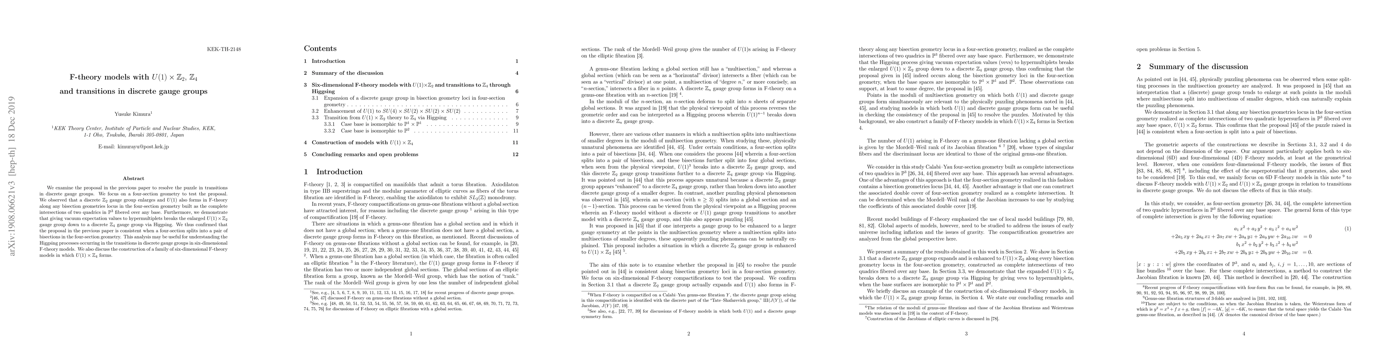 This paper investigates F-theory models with $U(1)\times \mathbb{Z}_2$ and $\mathbb{Z}_4$ gauge groups, demonstrating that a four-section geometry allows for the enlargement of a $\mathbb{Z}_2$ gauge group and the formation of $U(1)$, and that vacuum expectation values can break the $U(1)\times \mathbb{Z}_2$ gauge group down to $\mathbb{Z}_4$ via Higgsing, confirming the consistency of a previous proposal.