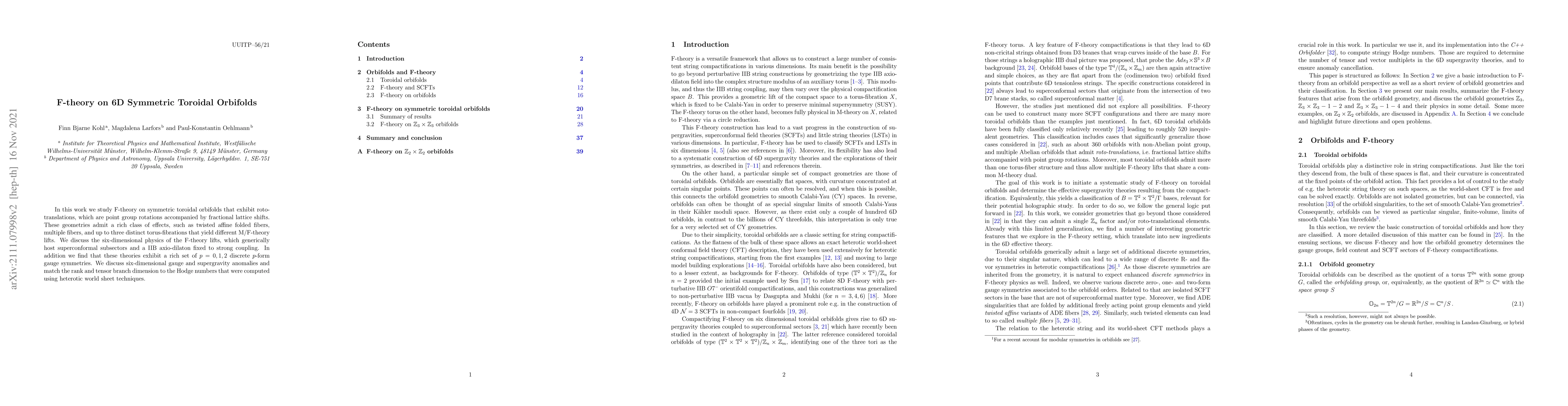 In this work we study F-theory on symmetric toroidal orbifolds that exhibit roto-translations, which are point group rotations accompanied by fractional lattice shifts. These geometries admit a rich class of effects, such as twisted affine folded fibers, multiple fibers, and up to three distinct torus-fibrations that yield different M/F-theory lifts. We discuss the six-dimensional physics of the F-theory lifts, which generically host superconformal subsectors and a IIB axio-dilaton fixed to strong coupling. In addition we find that these theories exhibit a rich set of p=0,1,2 discrete p-form gauge symmetries. We discuss six-dimensional gauge and supergravity anomalies and match the rank and tensor branch dimension to the Hodge numbers that were computed using heterotic world sheet techniques.