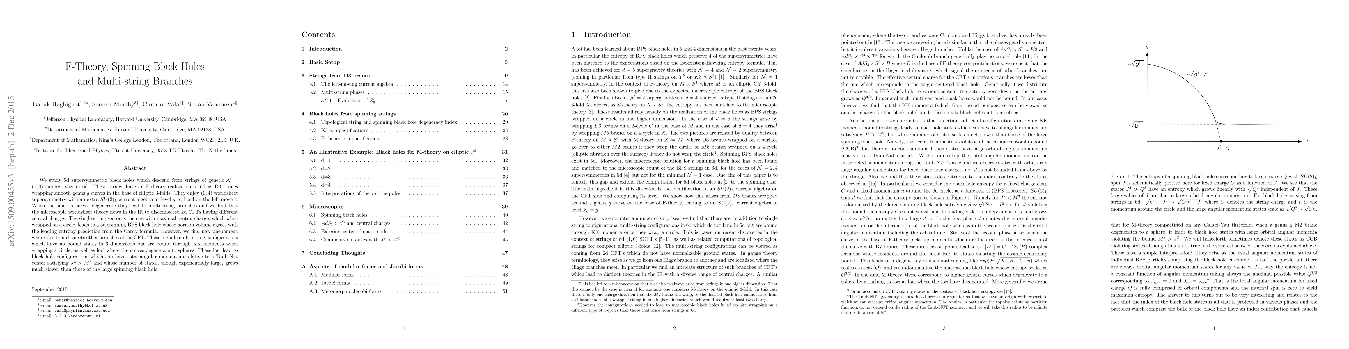 We study 5d supersymmetric black holes which descend from strings of generic $\mathcal{N}=(1,0)$ supergravity in 6d. These strings have an F-theory realization in 6d as D3 branes wrapping smooth genus $g$ curves in the base of elliptic 3-folds. They enjoy $(0,4)$ worldsheet supersymmetry with an extra $SU(2)_L$ current algebra at level $g$ realized on the left-movers. When the smooth curves degenerate they lead to multi-string branches and we find that the microscopic worldsheet theory flows in the IR to disconnected 2d CFTs having different central charges. The single string sector is the one with maximal central charge, which when wrapped on a circle, leads to a 5d spinning BPS black hole whose horizon volume agrees with the leading entropy prediction from the Cardy formula. However, we find new phenomena where this branch meets other branches of the CFT. These include multi-string configurations which have no bound states in 6 dimensions but are bound through KK momenta when wrapping a circle, as well as loci where the curves degenerate to spheres. These loci lead to black hole configurations which can have total angular momentum relative to a Taub-Nut center satisfying $J^2 > M^3$ and whose number of states, though exponentially large, grows much slower than those of the large spinning black hole.