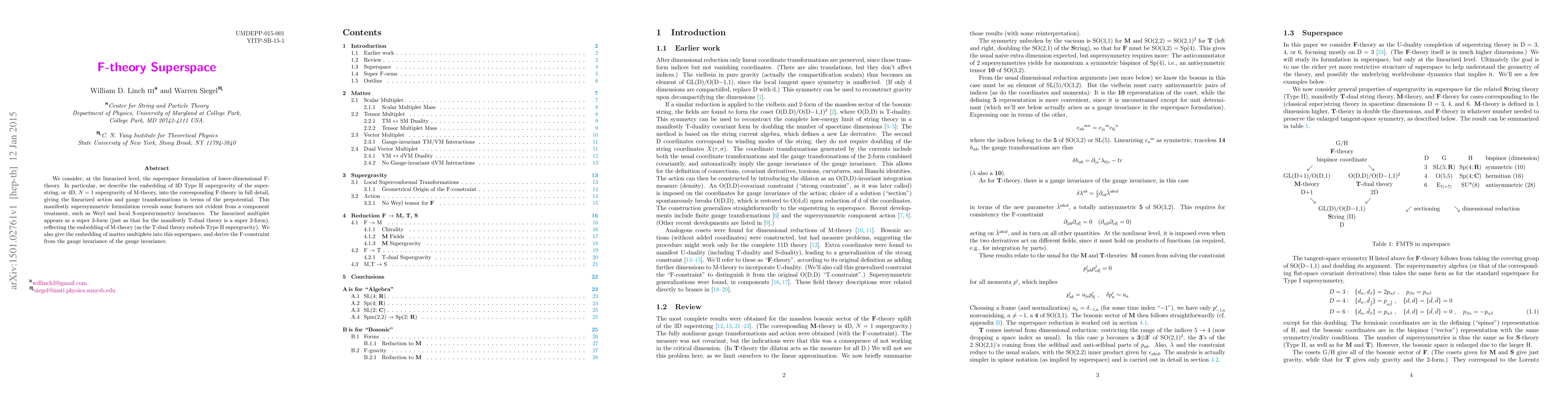 We consider, at the linearized level, the superspace formulation of lower-dimensional F-theory. In particular, we describe the embedding of 3D Type II supergravity of the superstring, or 4D, N=1 supergravity of M-theory, into the corresponding F-theory in full detail, giving the linearized action and gauge transformations in terms of the prepotential. This manifestly supersymmetric formulation reveals some features not evident from a component treatment, such as Weyl and local S-supersymmetry invariances. The linearized multiplet appears as a super 3-form (just as that for the manifestly T-dual theory is a super 2-form), reflecting the embedding of M-theory (as the T-dual theory embeds Type II supergravity). We also give the embedding of matter multiplets into this superspace, and derive the F-constraint from the gauge invariance of the gauge invariance.