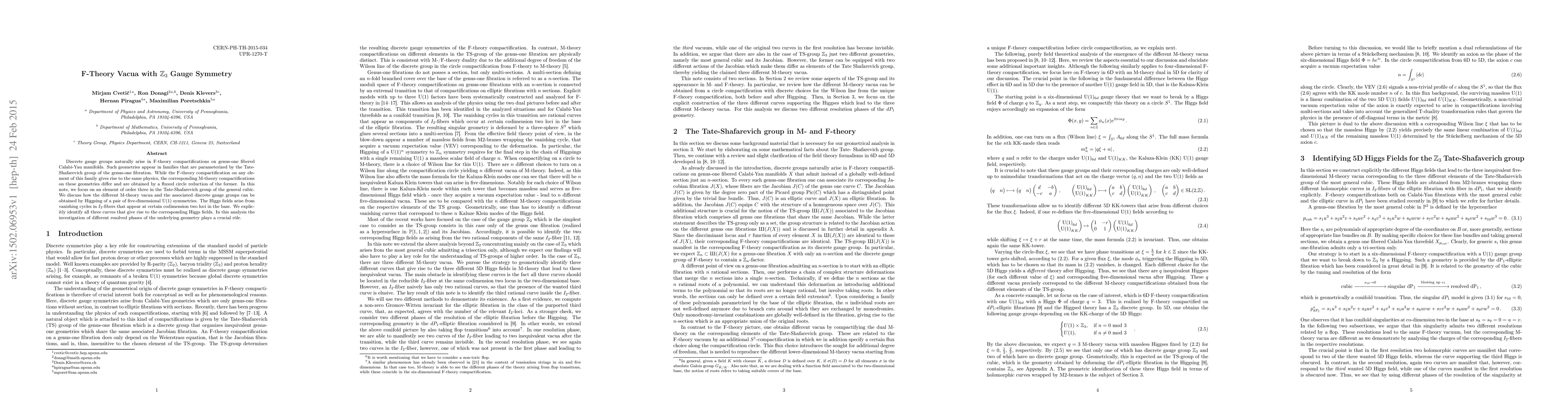 This paper explores F-theory compactifications on genus-one fibered Calabi-Yau manifolds, focusing on discrete gauge symmetries arising from the Tate-Shafarevich group. It identifies the specific Z_3 gauge symmetry and details how different M-theory vacua emerge through the Higgsing of U(1) symmetries, with Higgs fields originating from vanishing cycles in $I_2$-fibers.
