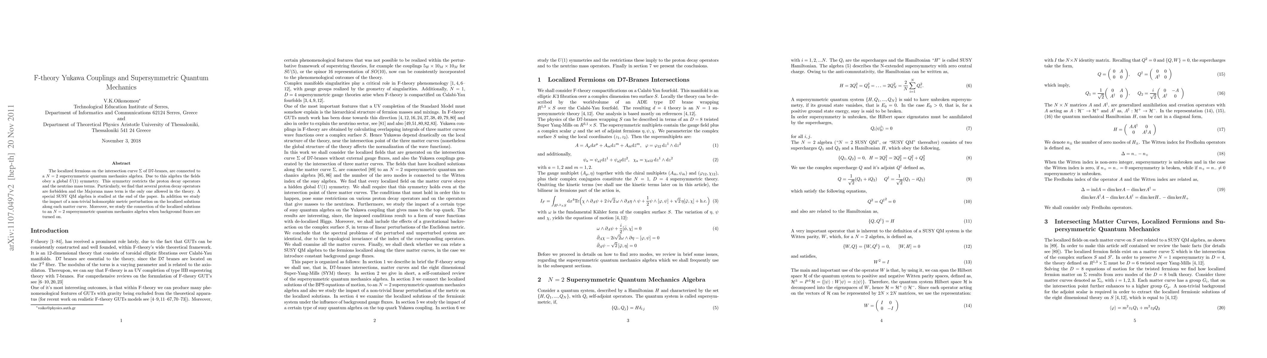 This paper explores F-theory Yukawa couplings through localized fermions on D7-branes intersecting a curve $\Sigma$, revealing a connection to N=2 supersymmetric quantum mechanics. The study finds that the global U(1) symmetry restricts proton decay operators and allows only the Majorana mass term, while also examining the effects of holomorphic metric perturbations and background fluxes on these localized solutions.