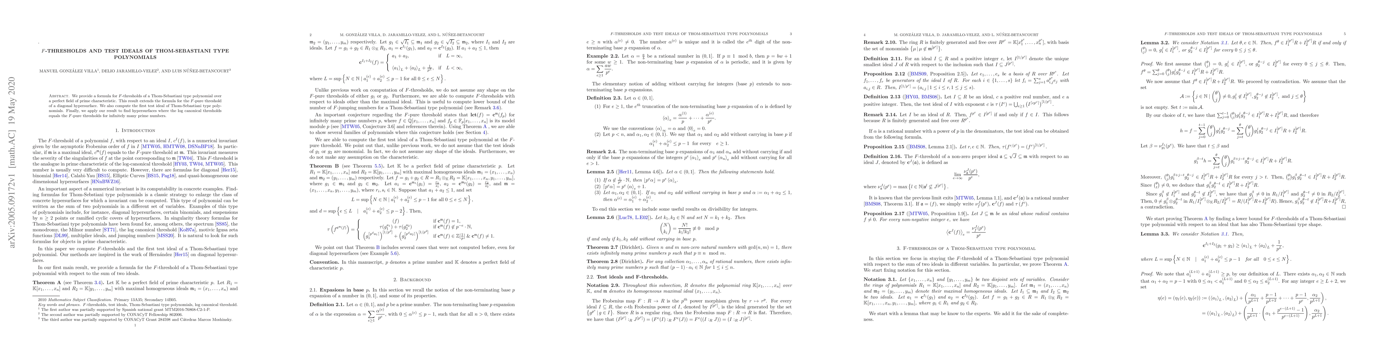 This paper derives a formula for the $F$-thresholds of Thom-Sebastiani type polynomials over fields of prime characteristic and computes their first test ideals, extending known results for diagonal hypersurfaces and identifying hypersurfaces where log canonical thresholds match $F$-pure thresholds for infinitely many primes.