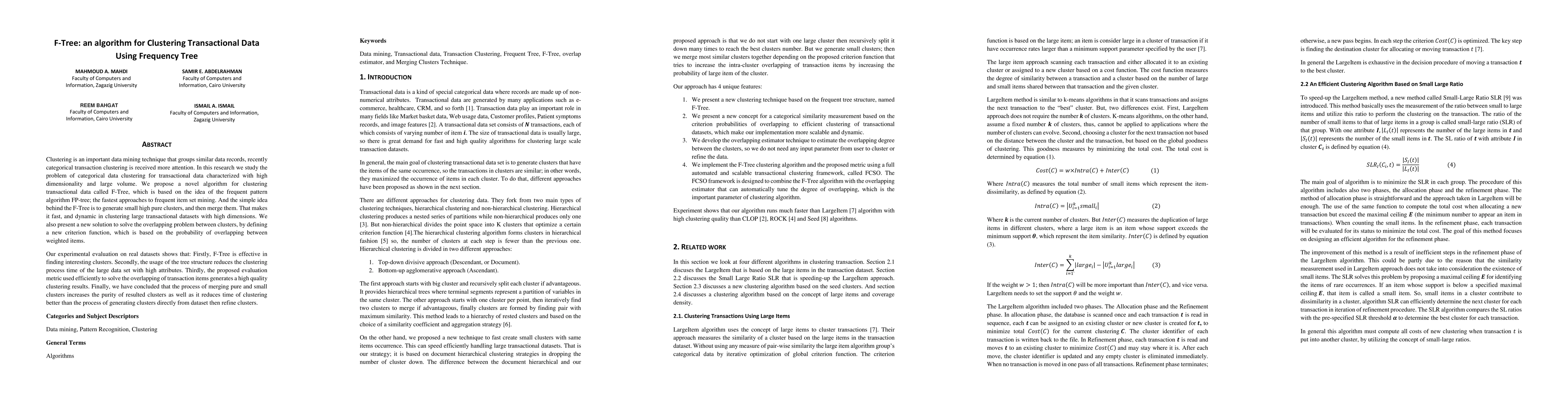 The F-Tree algorithm clusters high-dimensional, large-volume transactional data by generating small, high-pure clusters and merging them, leveraging the FP-tree method for efficient clustering. Experimental results show that F-Tree effectively finds clusters, reduces processing time, and handles overlapping items with a new criterion function, ultimately producing high-purity clusters faster than direct clustering methods.