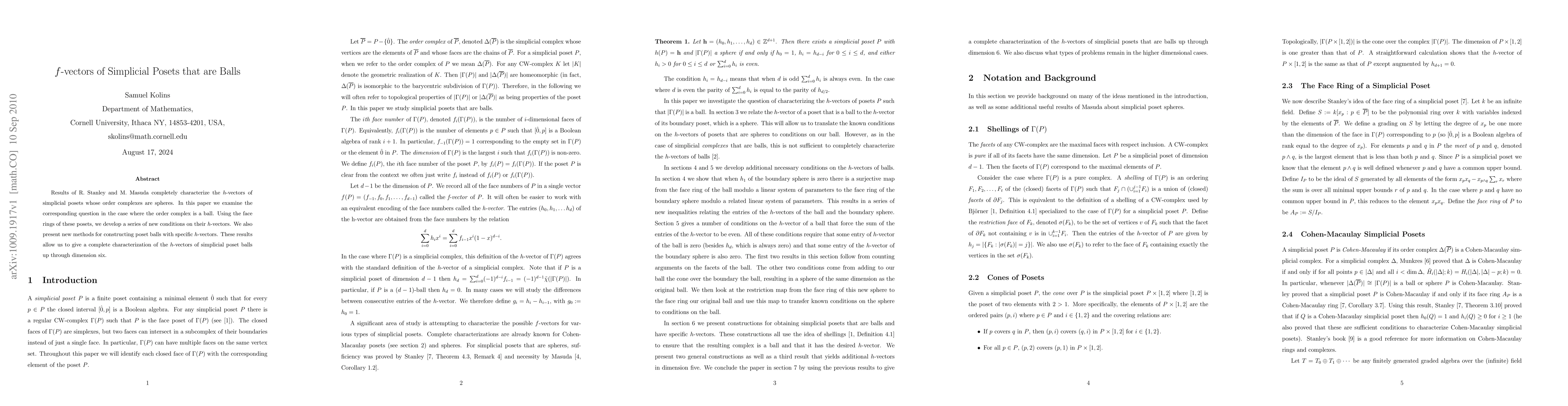The paper introduces new algebraic conditions on h-vectors derived from face rings of simplicial posets, enabling a complete characterization of poset balls up to dimension six.