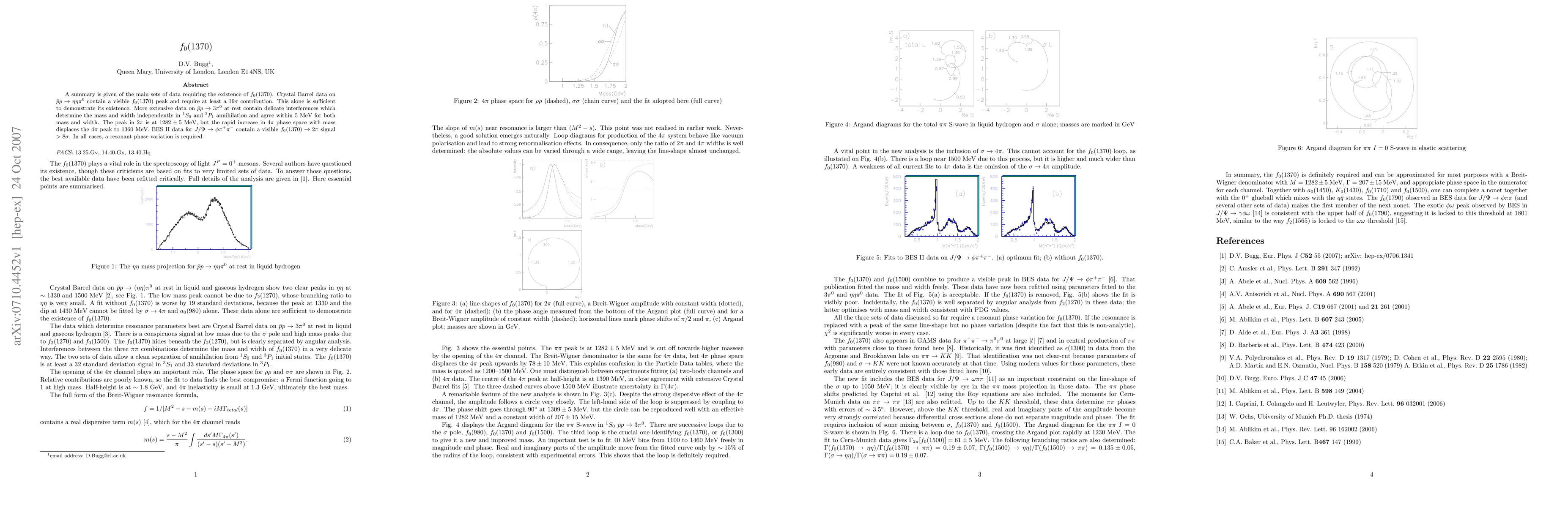 A summary is given of the main sets of data requiring the existence of f0(1370). Crystal Barrel data on pbar-p -> eta eta pizero contain a visible f0(1370) peak and require at least a 19 standard deviation contribution. This alone is sufficient to demonstrate its existence. More extensive data on pbar-p -> 3pizero at rest contain delicate interferences which determine the mass and width independently in 1S_0 and 3P_1 annihilation and agree within 5 MeV for both mass and width. The peak in 2pi is at 1282 +- 5 MeV, but the rapid increase in 4pi phase space with mass displaces the 4pi peak to 1360 MeV. BES II data for J/Psi -> phi-pi-\pi contain a visible f0(1370) -> 2pi signal >8 sigma. In all cases, a resonant phase variation is required.