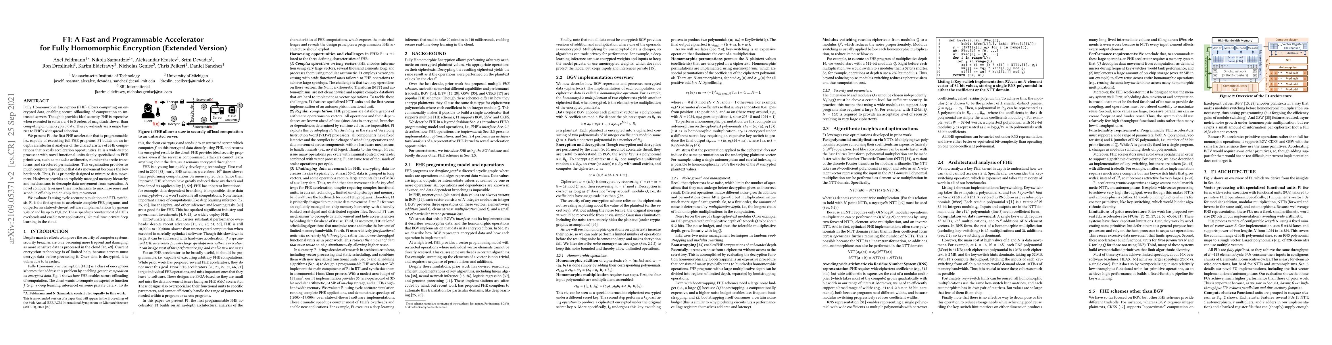 The paper introduces F1, a programmable accelerator designed to significantly speed up Fully Homomorphic Encryption (FHE) computations, which are typically 4 to 5 orders of magnitude slower than unencrypted data processing. F1 minimizes data movement through specialized functional units and an explicitly managed memory hierarchy, achieving up to 17,000x speedups over software implementations, thus enabling new applications like real-time private deep learning in the cloud.