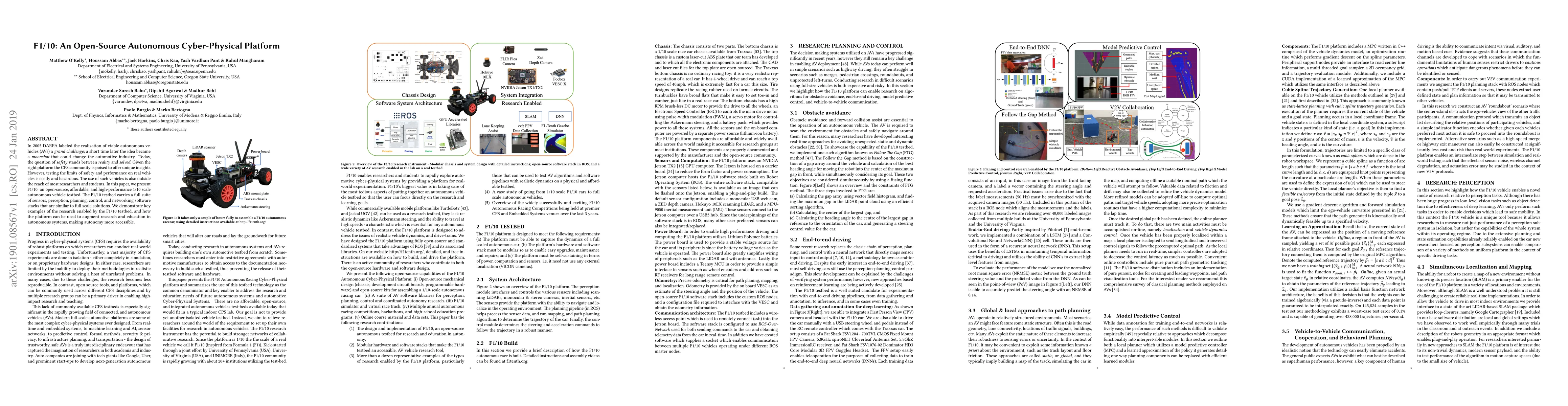 This paper introduces F1/10, an open-source, affordable 1/10 scale autonomous vehicle testbed designed to facilitate research and education in autonomous systems. The platform includes a full suite of sensors and software stacks, enabling researchers to explore safety and performance without the high costs and risks associated with full-scale vehicles.