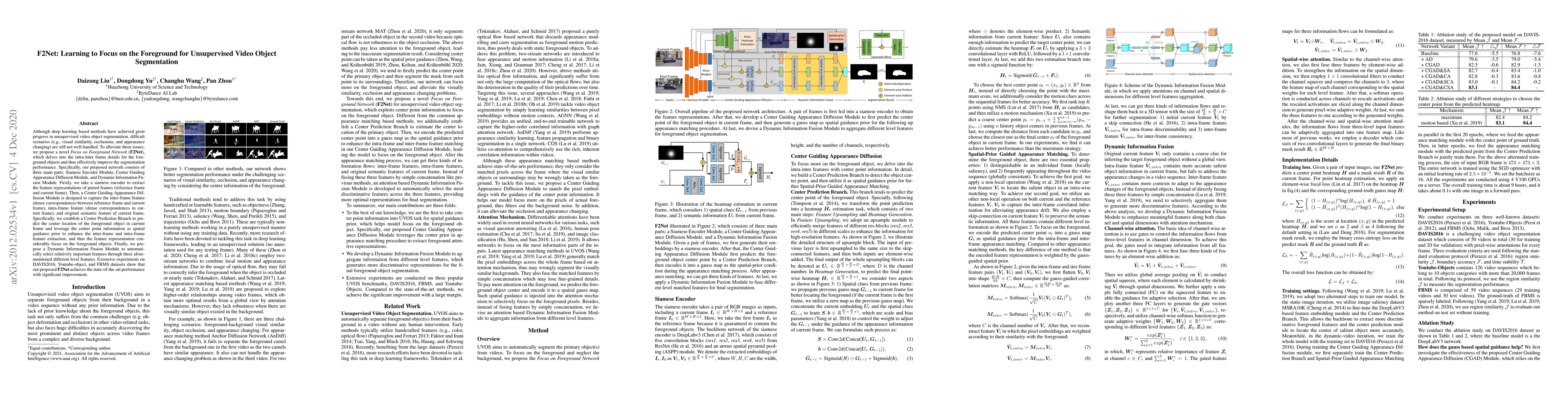 F2Net introduces a novel Focus on Foreground Network for unsupervised video object segmentation, addressing challenges like visual similarity and occlusions. The network combines a Siamese Encoder, Center Guiding Appearance Diffusion Module, and Dynamic Information Fusion Module to enhance foreground object segmentation, achieving state-of-the-art results on multiple datasets.