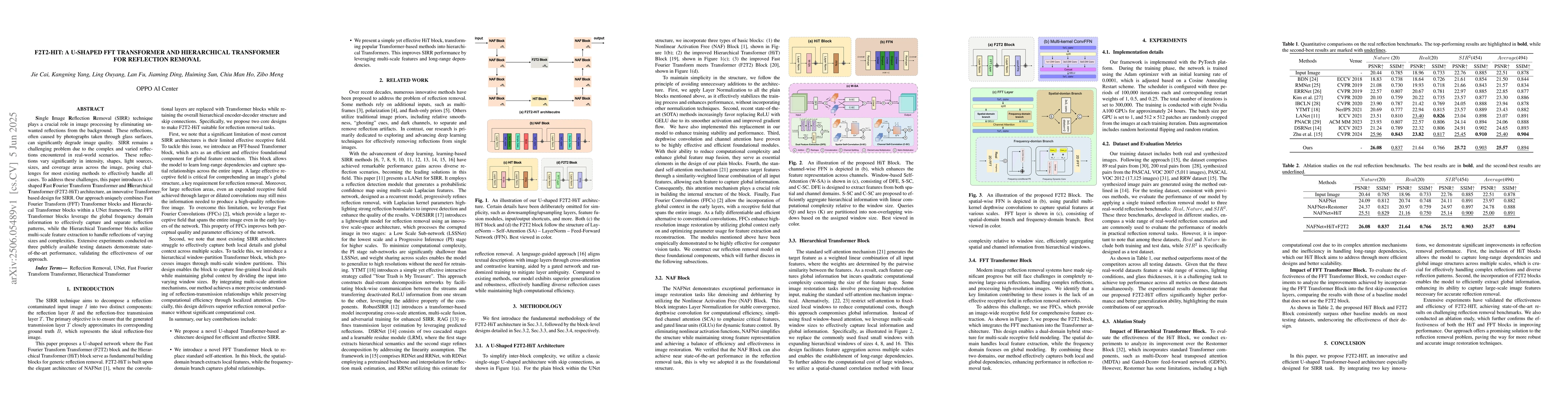 The paper presents F2T2-HiT, a novel U-shaped architecture combining Fast Fourier Transform (FFT) Transformer and Hierarchical Transformer blocks for single image reflection removal (SIRR). This approach effectively captures and separates reflection patterns using global frequency domain information and multi-scale feature extraction, outperforming existing methods on multiple datasets.