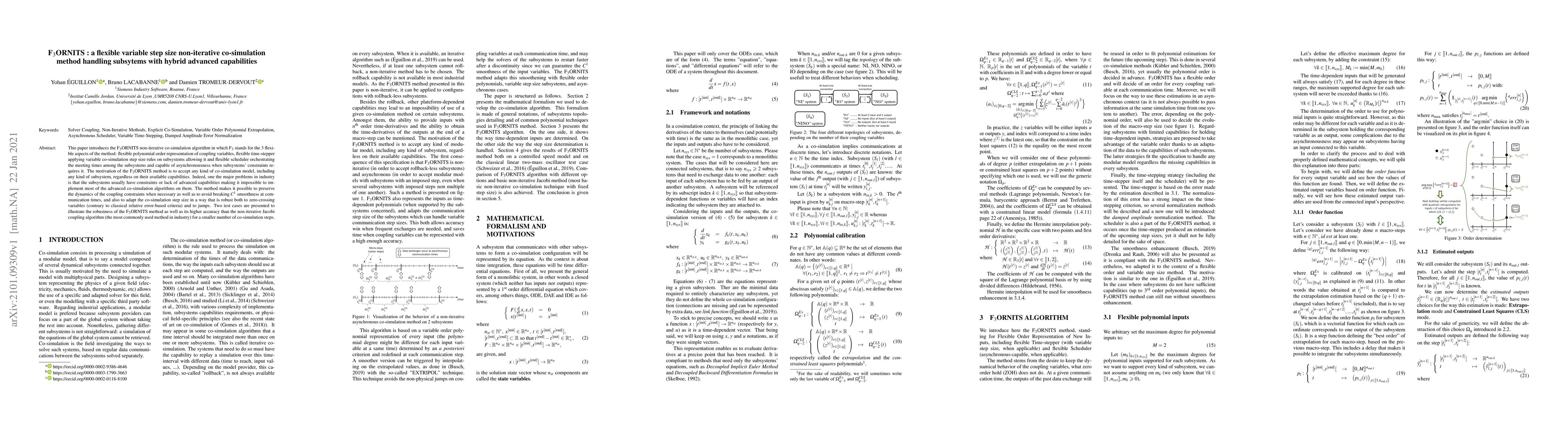 This paper introduces the F3ORNITS non-iterative co-simulation algorithm in which F3 stands for the 3 flexible aspects of the method: flexible polynomial order representation of coupling variables, flexible time-stepper applying variable co-simulation step size rules on subsystems allowing it and flexible scheduler orchestrating the meeting times among the subsystems and capable of asynchronousness when subsystems constraints requires it. The motivation of the F3ORNITS method is to accept any kind of co-simulation model, including any kind of subsystem, regardless on their available capabilities. Indeed, one the major problems in industry is that the subsystems usually have constraints or lack of advanced capabilities making it impossible to implement most of the advanced co-simulation algorithms on them. The method makes it possible to preserve the dynamics of the coupling constraints when necessary as well as to avoid breaking C1 smoothness at communication times, and also to adapt the co-simulation step size in a way that is robust both to zero-crossing variables (contrary to classical relative error-based criteria) and to jumps. Two test cases are presented to illustrate the robustness of the F3ORNITS method as well as its higher accuracy than the non-iterative Jacobi coupling algorithm (the most commonly used method in industry) for a smaller number of co-simulation steps.