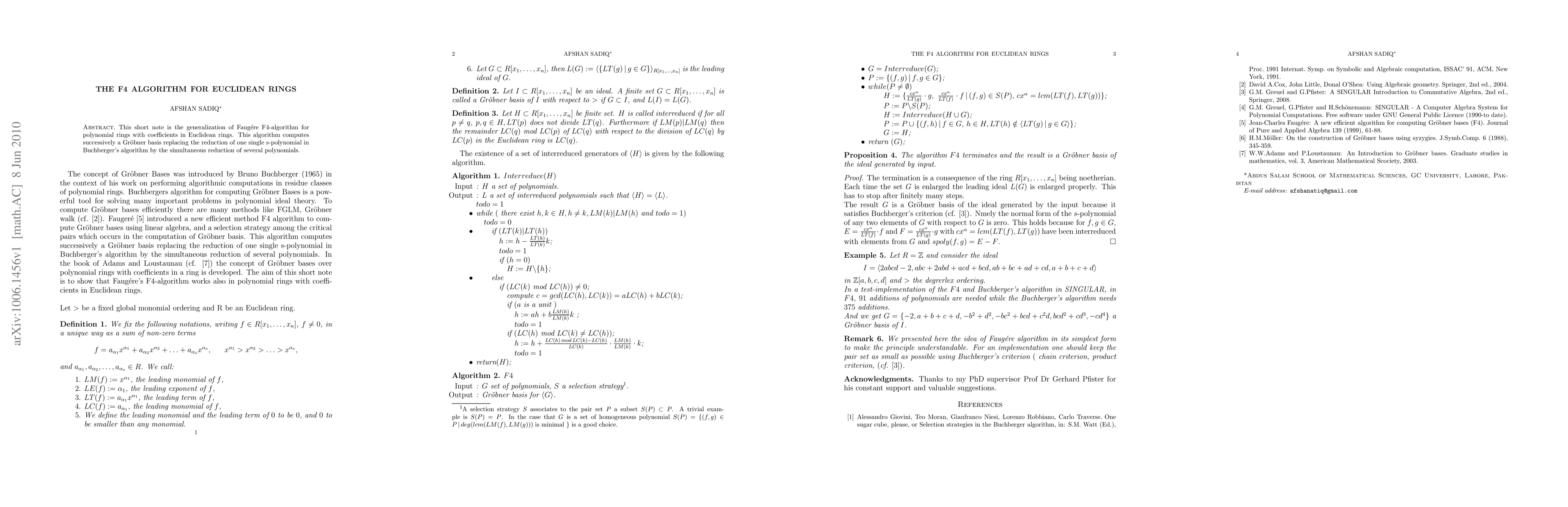 Summary: This paper generalizes the Faugere F4 algorithm for polynomial rings to Euclidean rings, employing simultaneous reduction of multiple polynomials to compute a Groebner basis instead of reducing a single s-polynomial.