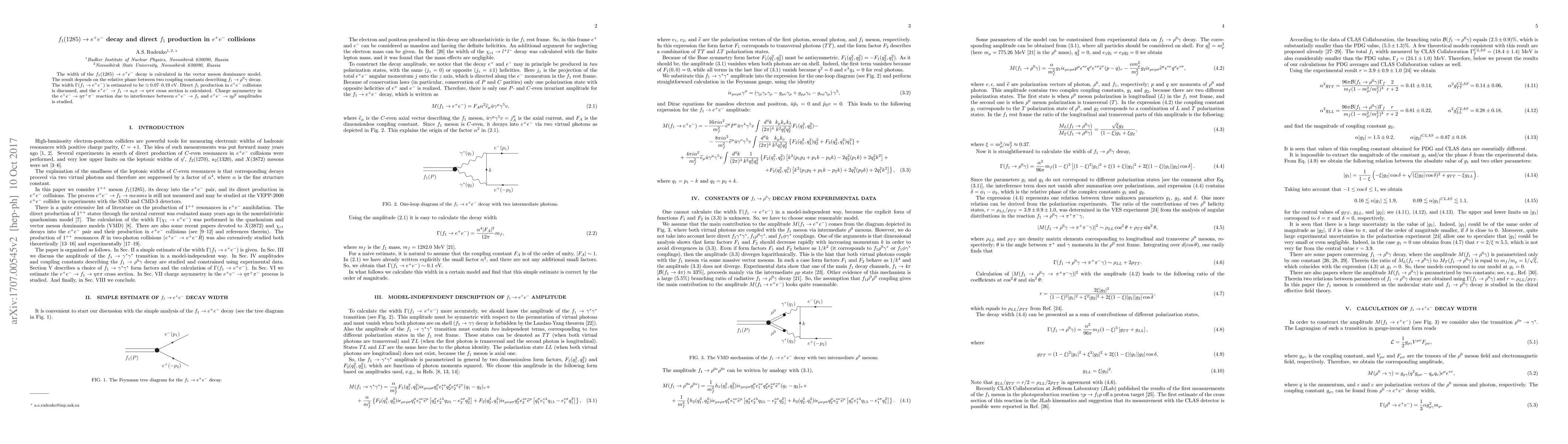 This paper calculates the decay width of the $f_1 (1285)$ meson into $e^+e^-$ using the vector meson dominance model, estimating it to be $\simeq 0.07-0.19$ eV. It also discusses direct $f_1$ production in $e^+e^-$ collisions and analyzes charge asymmetry in the $e^+e^- \to \eta \pi^+ \pi^-$ reaction due to interference effects.