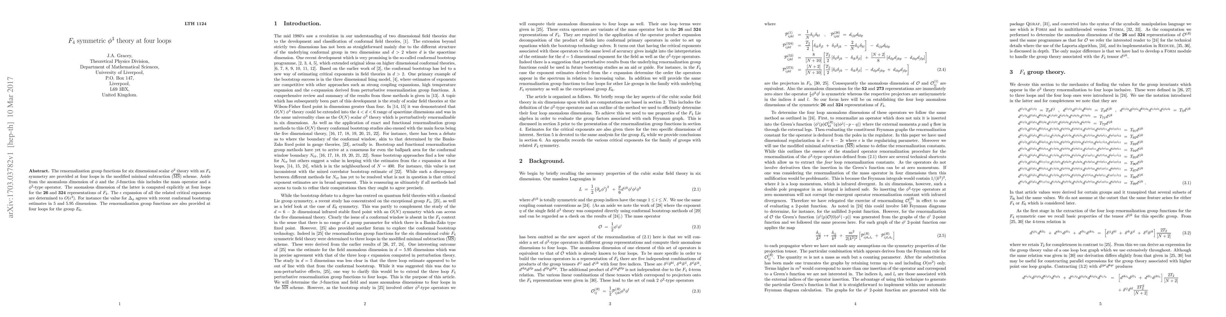 The renormalization group functions for six dimensional scalar $\phi^3$ theory with an $F_4$ symmetry are provided at four loops in the modified minimal subtraction (MSbar) scheme. Aside from the anomalous dimension of $\phi$ and the $\beta$-function this includes the mass operator and a $\phi^2$-type operator. The anomalous dimension of the latter is computed explicitly at four loops for the $\mathbf{26}$ and $\mathbf{324}$ representations of $F_4$. The $\epsilon$ expansion of all the related critical exponents are determined to $O(\epsilon^4)$. For instance the value for $\Delta_\phi$ agrees with recent conformal bootstrap estimates in $5$ and $5.95$ dimensions. The renormalization group functions are also provided at four loops for the group $E_6$.
