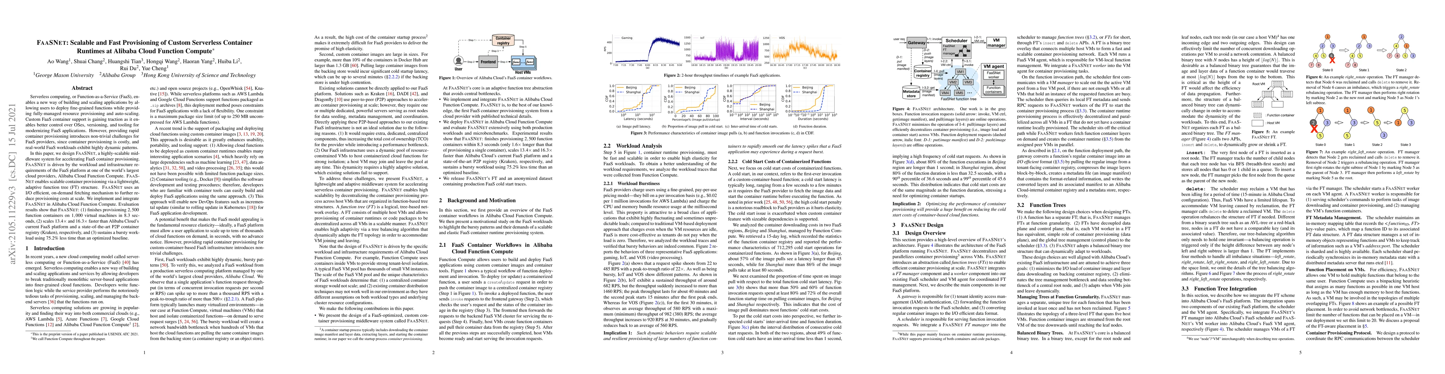 FaaSNet accelerates scalable and fast provisioning of custom serverless container runtimes at Alibaba Cloud Function Compute by employing a lightweight adaptive function tree and an I/O efficient on-demand fetching mechanism, achieving significant speedups and reduced provisioning costs compared to existing platforms.