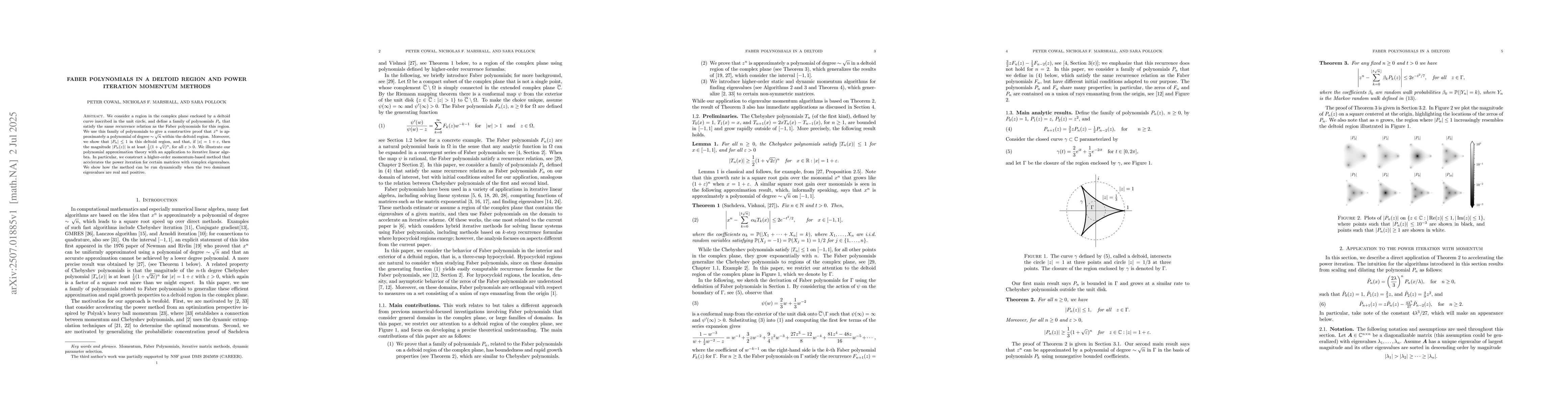 We consider a region in the complex plane enclosed by a deltoid curve inscribed in the unit circle, and define a family of polynomials $P_n$ that satisfy the same recurrence relation as the Faber polynomials for this region. We use this family of polynomials to give a constructive proof that $z^n$ is approximately a polynomial of degree $\sim\sqrt{n}$ within the deltoid region. Moreover, we show that $|P_n| \le 1$ in this deltoid region, and that, if $|z| = 1+\varepsilon$, then the magnitude $|P_n(z)|$ is at least $\frac{1}{3}(1+\sqrt{\varepsilon})^n$, for all $\varepsilon > 0$. We illustrate our polynomial approximation theory with an application to iterative linear algebra. In particular, we construct a higher-order momentum-based method that accelerates the power iteration for certain matrices with complex eigenvalues. We show how the method can be run dynamically when the two dominant eigenvalues are real and positive.