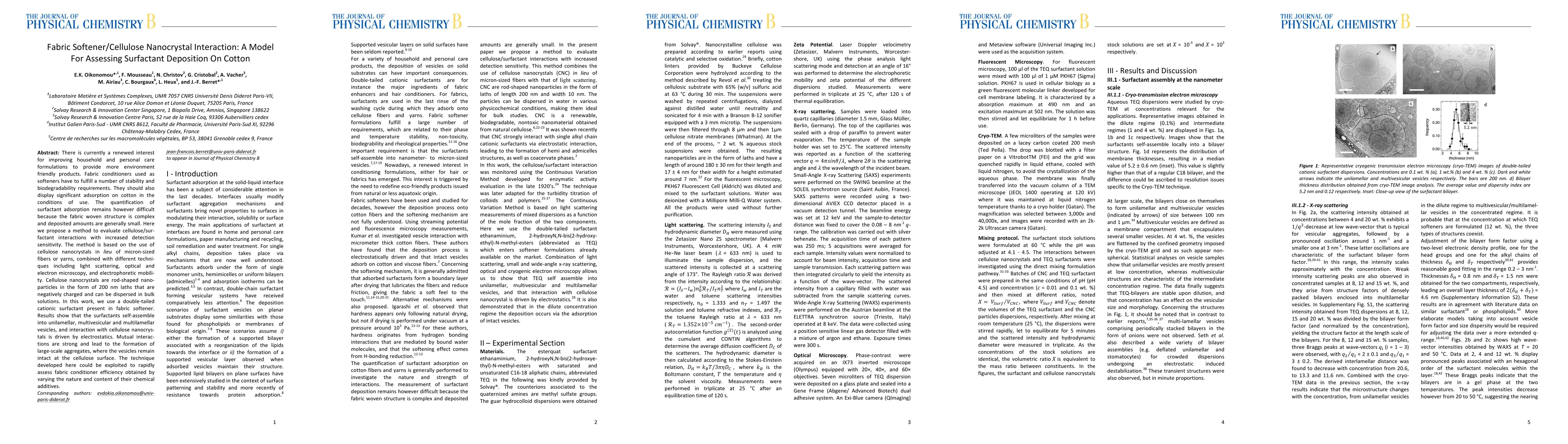 There is currently a renewed interest for improving household and personal care formulations to provide more environment friendly products. Fabric conditioners used as softeners have to fulfill a number of stability and biodegradability requirements. They should also display significant adsorption on cotton in the conditions of use. The quantification of surfactant adsorption remains however difficult because the fabric woven structure is complex and deposited amounts are generally small. Here we propose a method to evaluate cellulose/sur-factant interactions with increased detection sensitivity. The method is based on the use of cellulose nanocrystals in lieu of micron-sized fibers or yarns, combined with different techni-ques including light scattering, optical and electron microscopy, and electrophoretic mobili-ty. Cellulose nanocrystals are rod-shaped nano-particles in the form of 200 nm laths that are negatively charged and can be dispersed in bulk solutions. In this work, we use a double-tailed cationic surfactant present in fabric softener. Results show that the surfactants self-assemble into unilamellar, multivesicular and multilamellar vesicles, and interaction with cellulose nanocrys-tals is driven by electrostatics. Mutual interac-tions are strong and lead to the formation of large-scale aggregates, where the vesicles remain intact at the cellulose surface. The technique developed here could be exploited to rapidly assess fabric conditioner efficiency obtained by varying the nature and content of their chemical additives.