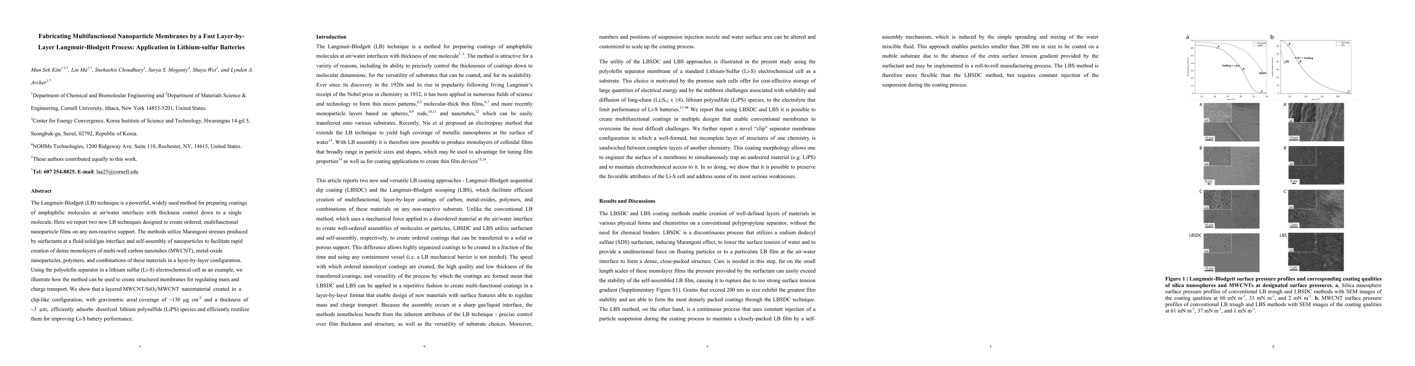 This paper presents innovative Langmuir-Blodgett techniques for rapidly fabricating multifunctional nanoparticle membranes, demonstrating their application in enhancing lithium-sulfur battery performance by creating a structured separator that adsorbs lithium polysulfide and improves battery efficiency.