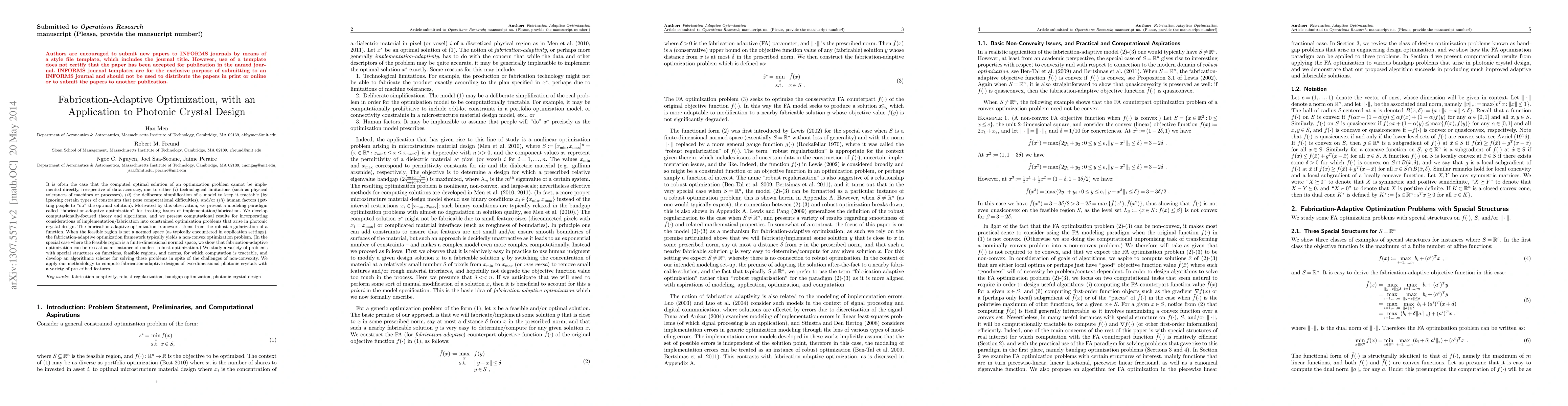 This paper introduces a "fabrication-adaptive optimization" framework to address implementation challenges in optimization problems, particularly in photonic crystal design. The framework incorporates technological, model simplification, and human factors to yield feasible solutions, often resulting in non-convex optimization problems. The authors develop algorithms to solve these problems and demonstrate their application in designing two-dimensional photonic crystals.