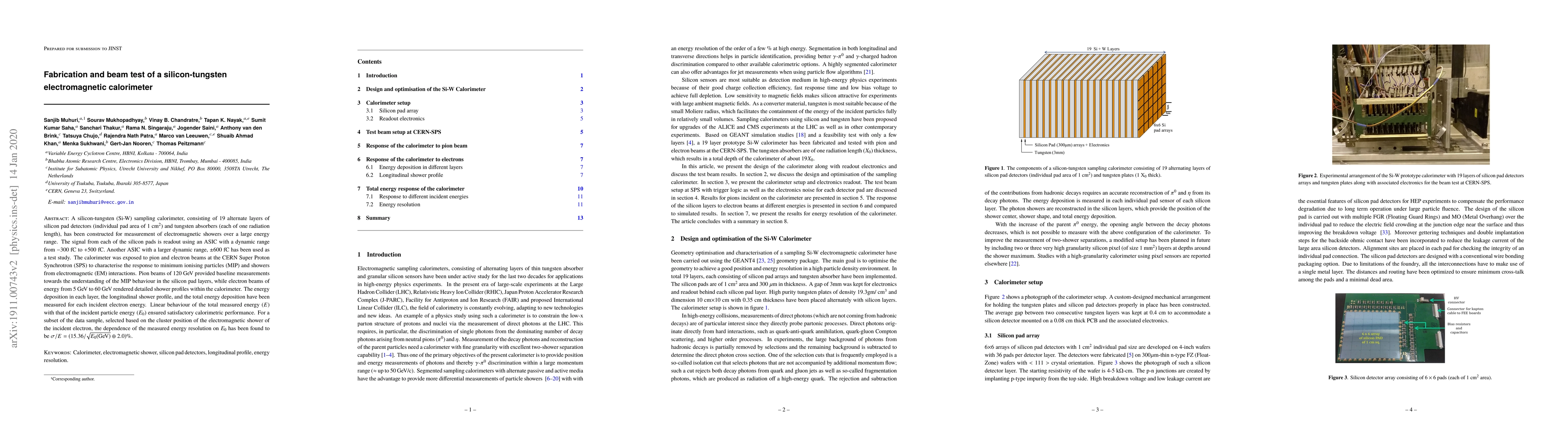 This paper details the construction and beam test of a silicon-tungsten electromagnetic calorimeter, which alternates silicon pad detectors and tungsten absorbers to measure electromagnetic showers. The device demonstrated satisfactory performance in energy deposition measurements and showed a linear relationship between measured and incident particle energy, with an energy resolution of $\sigma/E = (15.36/\sqrt{E_{0}(\mathrm{GeV})} \oplus 2.0) \%$.