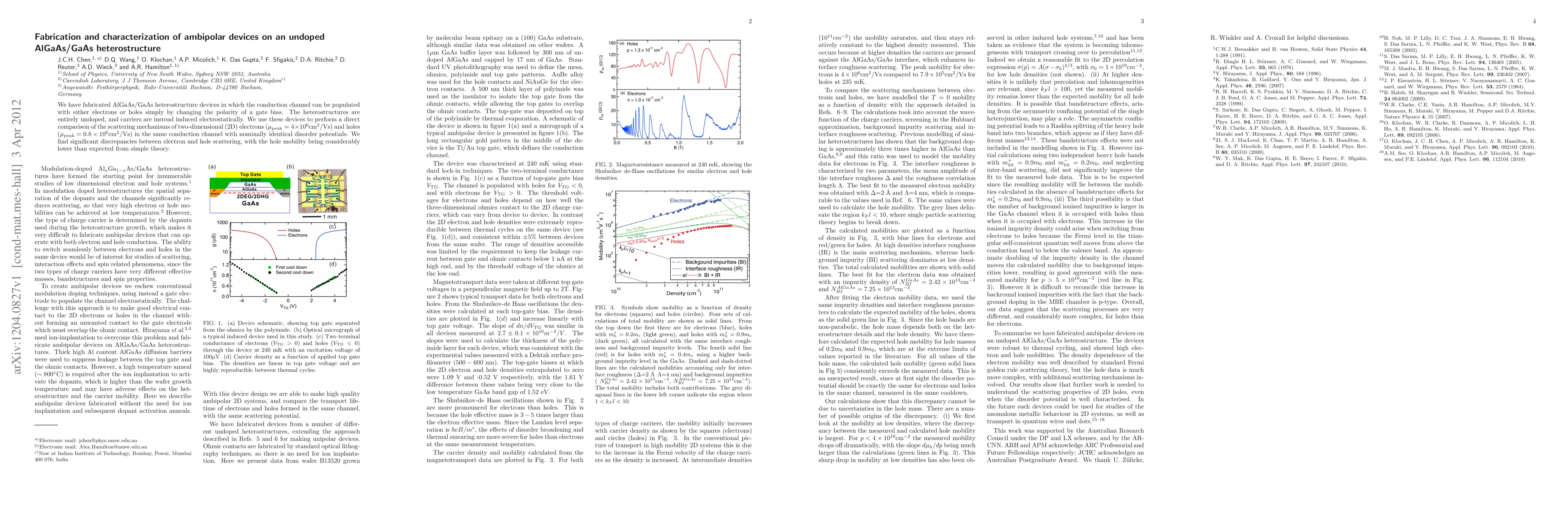 This paper fabricates undoped AlGaAs/GaAs heterostructure devices that can support ambipolar conduction by altering gate bias, enabling direct comparison of electron and hole scattering mechanisms. Results show significant discrepancies in mobility, with hole mobility much lower than theoretical predictions.
