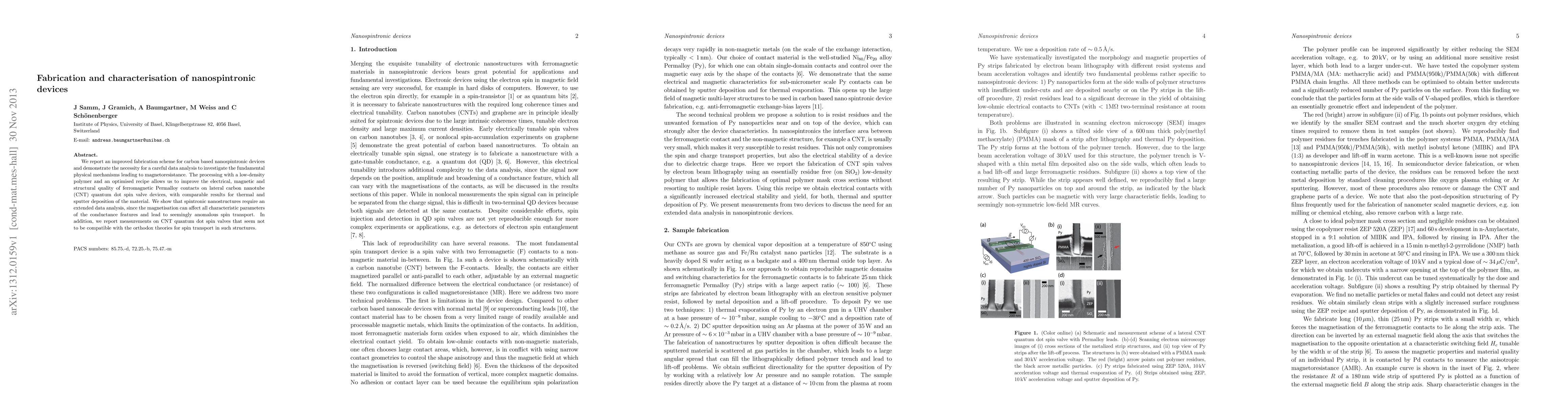 We report an improved fabrication scheme for carbon based nanospintronic devices and demonstrate the necessity for a careful data analysis to investigate the fundamental physical mechanisms leading to magnetoresistance. The processing with a low-density polymer and an optimised recipe allows us to improve the electrical, magnetic and structural quality of ferromagnetic Permalloy contacts on lateral carbon nanotube (CNT) quantum dot spin valve devices, with comparable results for thermal and sputter deposition of the material. We show that spintronic nanostructures require an extended data analysis, since the magnetisation can affect all characteristic parameters of the conductance features and lead to seemingly anomalous spin transport. In addition, we report measurements on CNT quantum dot spin valves that seem not to be compatible with the orthodox theories for spin transport in such structures.