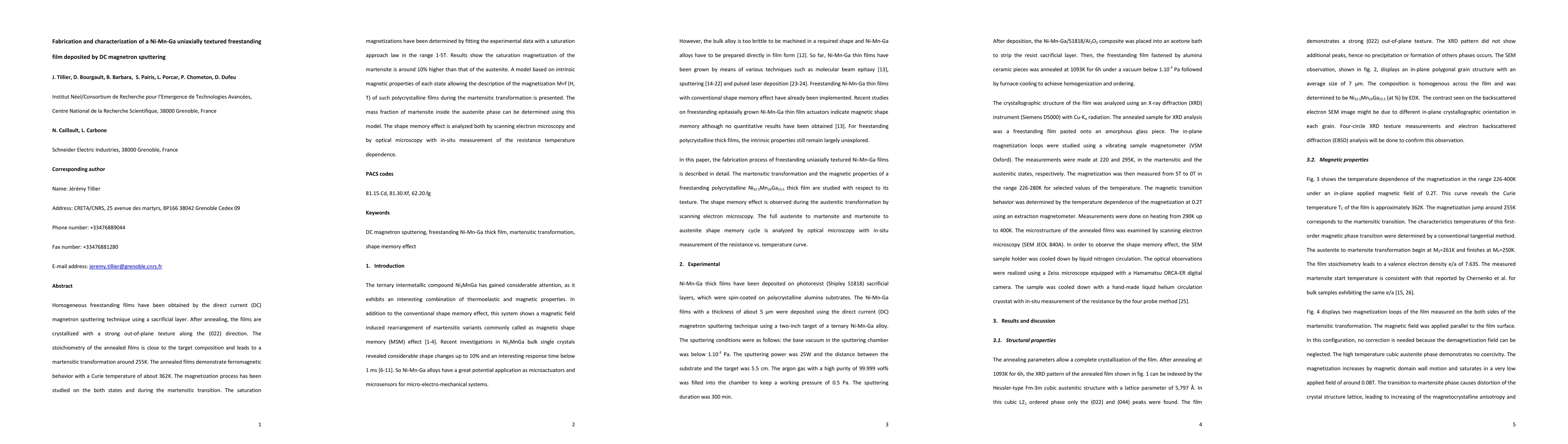 Homogeneous freestanding films have been obtained by the direct current (DC) magnetron sputtering technique using a sacrificial layer. After annealing, the films are crystallized with a strong out-of-plane texture along the (022) direction. The stoichiometry of the annealed films is close to the target composition and leads to a martensitic transformation around 255K. The annealed films demonstrate ferromagnetic behavior with a Curie temperature of about 362K. The magnetization process has been studied on the both states and during the martensitic transition. The saturation magnetizations have been determined by fitting the experimental data with a saturation approach law in the range 1-5T. Results show the saturation magnetization of the martensite is around 10% higher than that of the austenite. A model based on intrinsic magnetic properties of each state allowing the description of the magnetization M=f (H, T) of such polycrystalline films during the martensitic transformation is presented. The mass fraction of martensite inside the austenite phase can be determined using this model. The shape memory effect is analyzed both by scanning electron microscopy and by optical microscopy with in-situ measurement of the resistance temperature dependence.