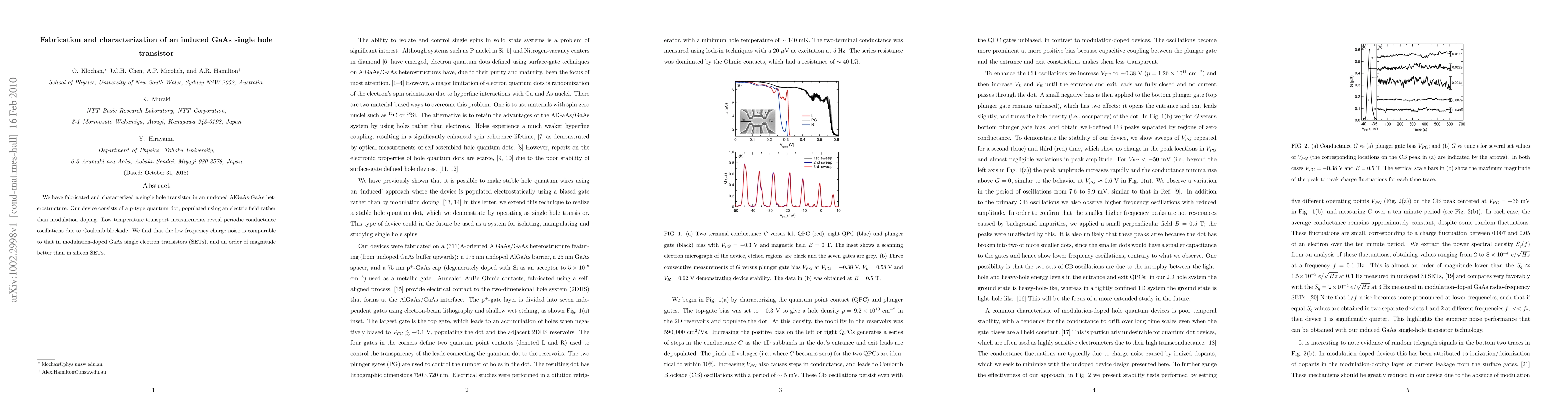 Summary: Researchers fabricated a single hole transistor in an undoped AlGaAs-GaAs heterostructure using an electric field to populate a p-type quantum dot, achieving periodic conductance oscillations due to Coulomb blockade with low frequency charge noise comparable to modulation-doped GaAs single electron transistors (SETs).
