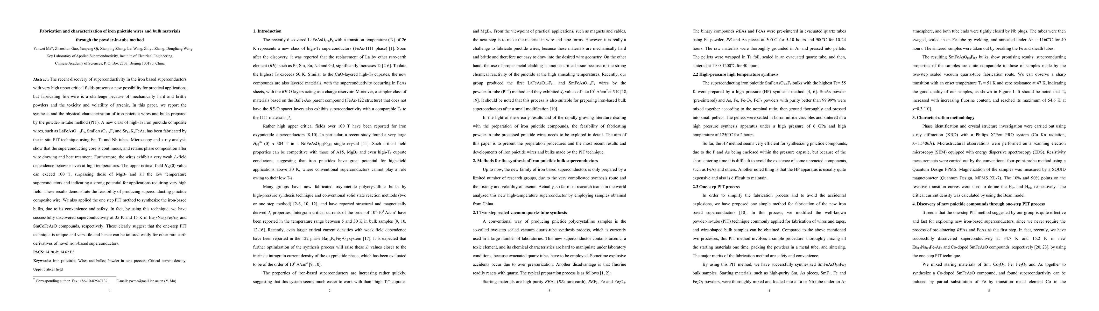 This paper reports the fabrication of iron pnictide wires and bulk materials using the powder-in-tube method, achieving high-temperature superconductivity and demonstrating weak Jc-field dependence. The method successfully synthesizes composite wires with continuous superconducting cores and high upper critical fields, surpassing those of MgB2.