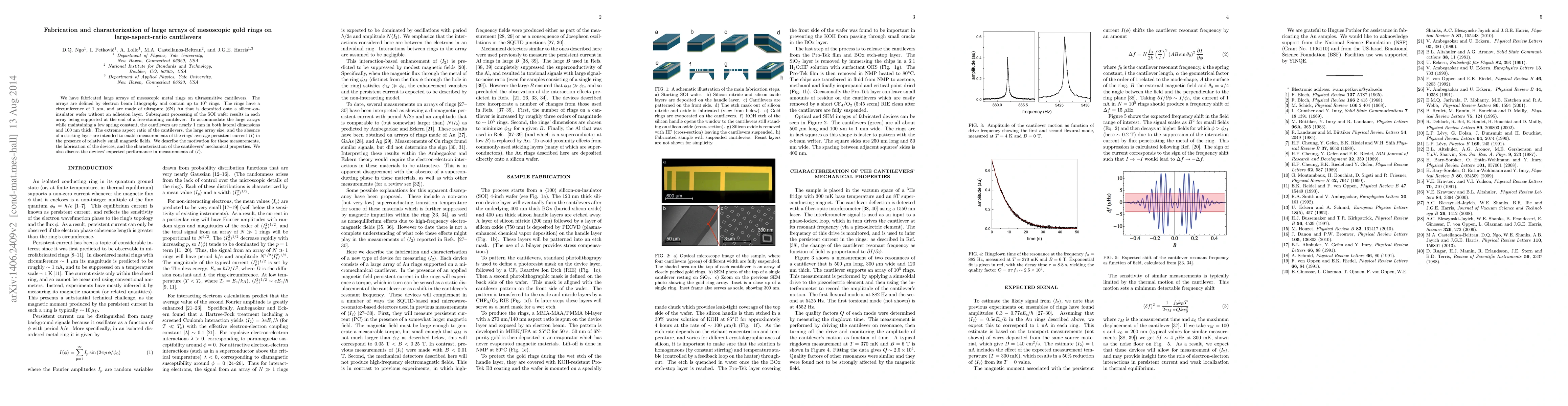 This paper details the fabrication of large arrays of mesoscopic gold rings on ultrasensitive cantilevers using electron beam lithography, and characterizes the mechanical properties of the cantilevers to enable measurements of the rings' average persistent current. The design aims to facilitate studies in the presence of small magnetic fields.