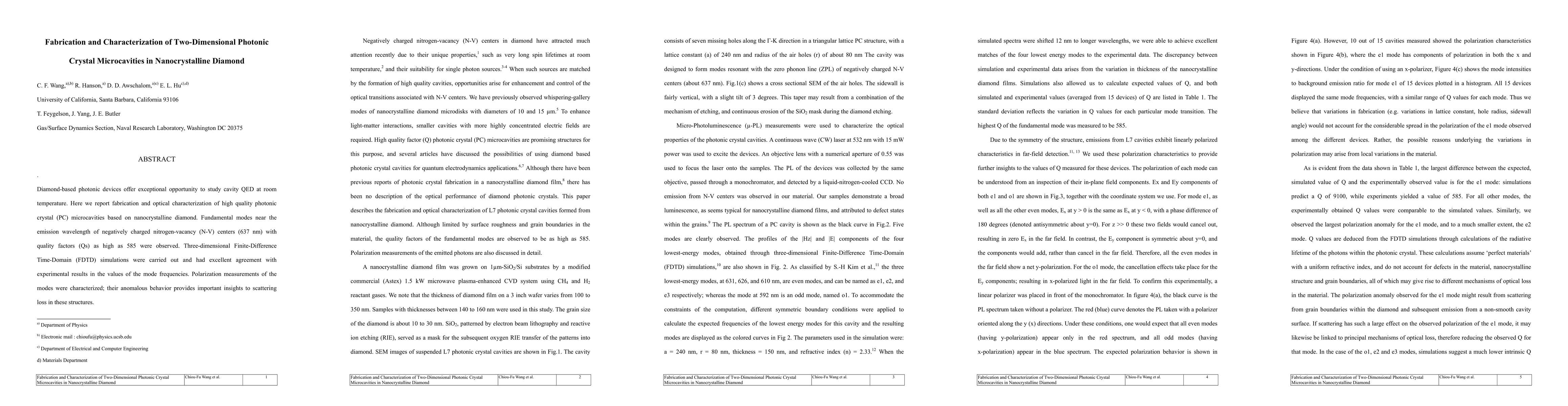 This paper details the fabrication and optical characterization of high-quality photonic crystal microcavities in nanocrystalline diamond, achieving fundamental modes near 637 nm with quality factors up to 585. Experimental results align well with FDTD simulations, and polarization measurements reveal insights into scattering loss in these structures.