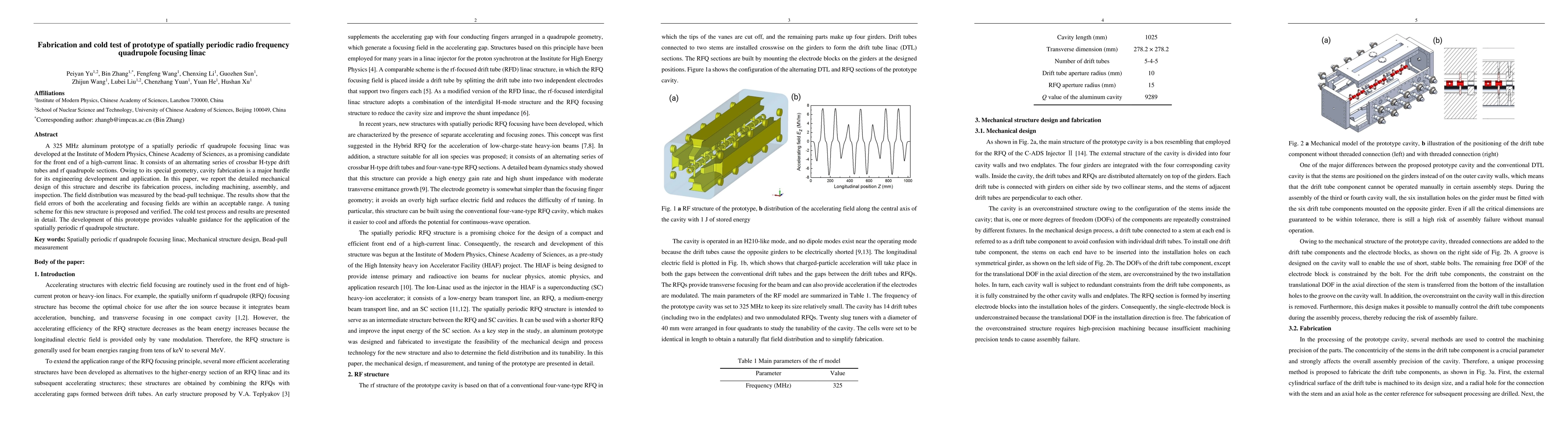 A 325 MHz aluminum prototype of a spatially periodic rf quadrupole focusing linac was developed at the Institute of Modern Physics, Chinese Academy of Sciences, as a promising candidate for the front end of a high-current linac. It consists of an alternating series of crossbar H-type drift tubes and rf quadrupole sections. Owing to its special geometry, cavity fabrication is a major hurdle for its engineering development and application. In this paper, we report the detailed mechanical design of this structure and describe its fabrication process, including machining, assembly, and inspection. The field distribution was measured by the bead-pull technique. The results show that the field errors of both the accelerating and focusing fields are within an acceptable range. A tuning scheme for this new structure is proposed and verified. The cold test process and results are presented in detail. The development of this prototype provides valuable guidance for the application of the spatially periodic rf quadrupole structure.