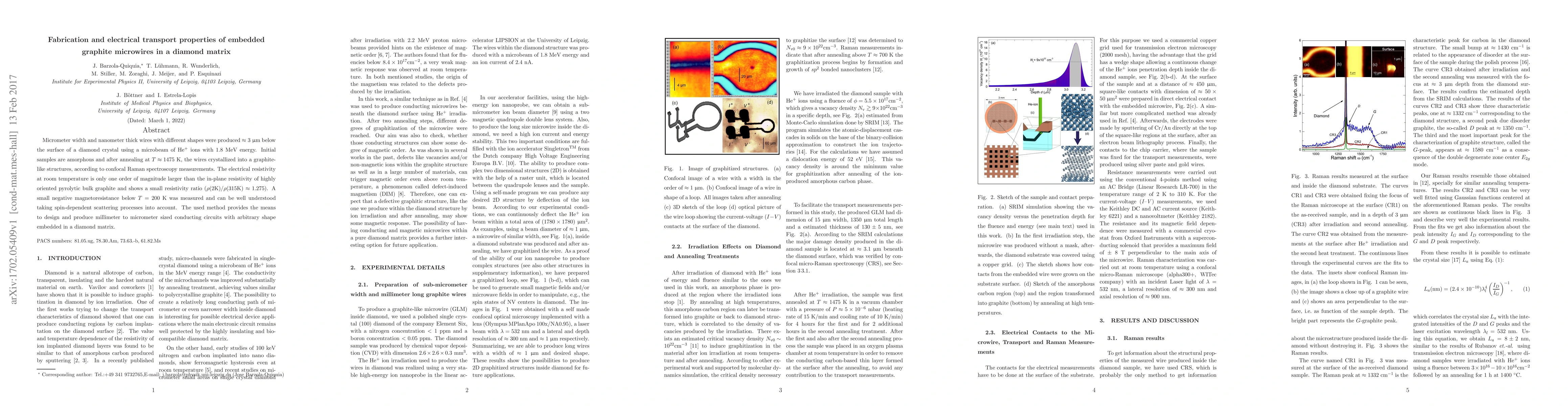 Micrometer width and nanometer thick wires with different shapes were produced $\approx 3~\upmu$m below the surface of a diamond crystal using a microbeam of He$^+$ ions with 1.8~MeV energy. Initial samples are amorphous and after annealing at $T\approx 1475$~K, the wires crystallized into a graphite-like structures, according to confocal Raman spectroscopy measurements. The electrical resistivity at room temperature is only one order of magnitude larger than the in-plane resistivity of highly oriented pyrolytic bulk graphite and shows a small resistivity ratio($\rho(2{\rm K})/\rho(315{\rm K}) \approx 1.275$). A small negative magnetoresistance below $T=200$~K was measured and can be well understood taking spin-dependent scattering processes into account. The used method provides the means to design and produce millimeter to micrometer sized conducting circuits with arbitrary shape embedded in a diamond matrix.
