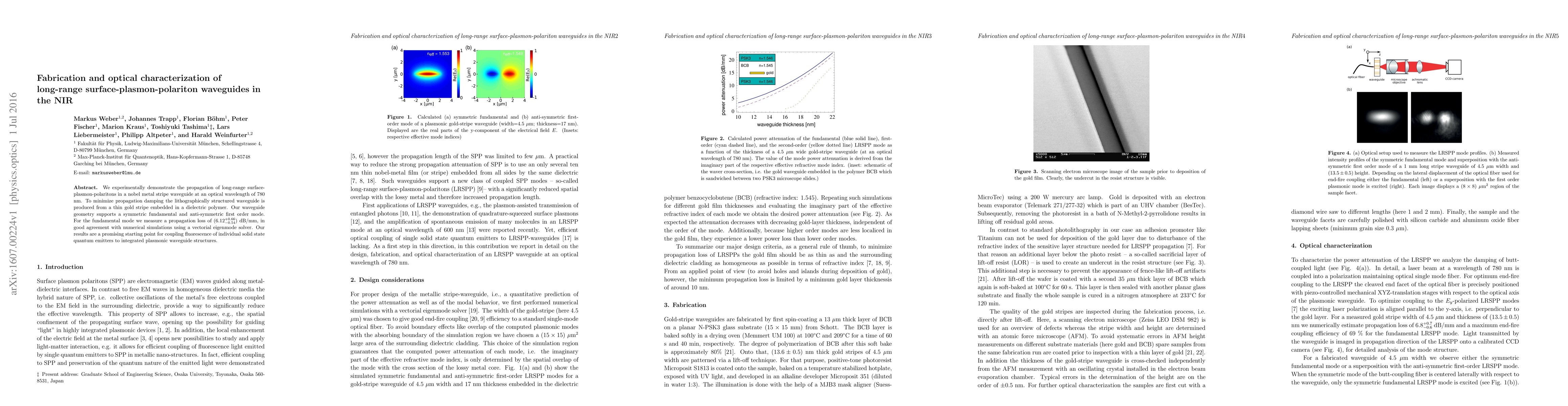 We experimentally demonstrate the propagation of long-range surface plasmon-polaritons in a nobel metal stripe waveguide at an optical wavelength of 780 nm. To minimize propagation damping the lithographically structured waveguide is produced from a thin gold stripe embedded in a dielectric polymer. Our waveguide geometry supports a symmetric fundamental and anti-symmetric first order mode. For the fundamental mode we measure a propagation loss of $(6.12^{+0.66} _{-0.54})$ dB/mm, in good agreement with numerical simulations using a vectorial eigenmode solver. Our results are a promising starting point for coupling fluorescence of individual solid state quantum emitters to integrated plasmonic waveguide structures.