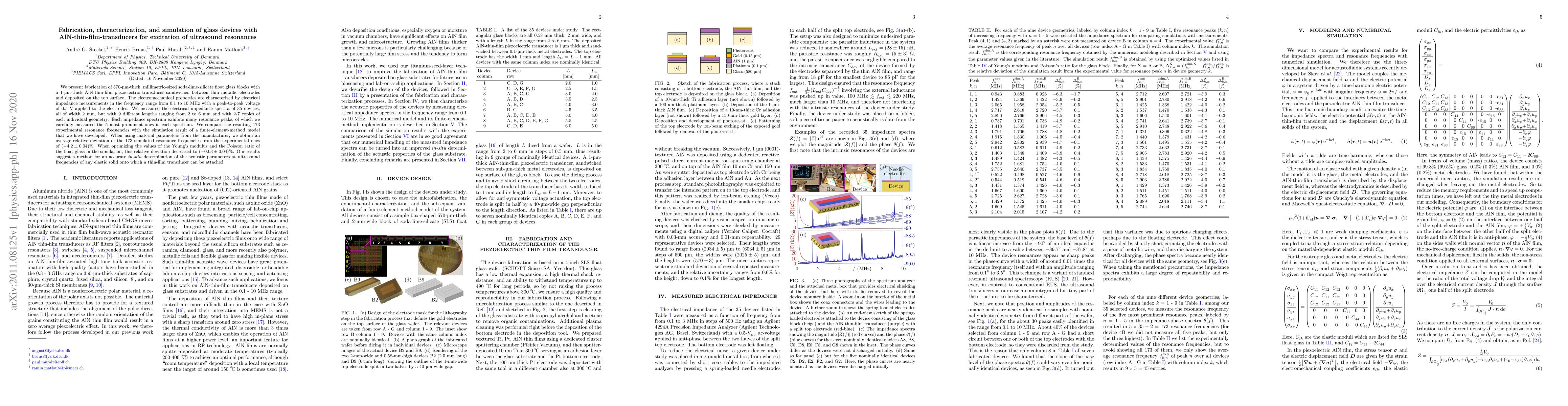 We present fabrication of 570-um-thick, millimeter-sized soda-lime-silicate float glass blocks with a 1-um-thick AlN-thin-film piezoelectric transducer sandwiched between thin metallic electrodes and deposited on the top surface. The electro-mechanical properties are characterized by electrical impedance measurements in the frequency range from 0.1 to 10 MHz with a peak-to-peak voltage of 0.5 V applied to the electrodes. We measured the electrical impedance spectra of 35 devices, all of width 2 mm, but with 9 different lengths ranging from 2 to 6 mm and with 2-7 copies of each individual geometry. Each impedance spectrum exhibits many resonance peaks, of which we carefully measured the 5 most prominent ones in each spectrum. We compare the resulting 173 experimental resonance frequencies with the simulation result of a finite-element-method model that we have developed. When using material parameters from the manufacturer, we obtain an average relative deviation of the 173 simulated resonance frequencies from the experimental ones of (-4.2 +/-0.04)%. When optimizing the values of the Young's modulus and the Poisson ratio of the float glass in the simulation, this relative deviation decreased to (-0.03 +/- 0.04)%. Our results suggest a method for an accurate in-situ determination of the acoustic parameters at ultrasound frequencies of any elastic solid onto which a thin-film transducer can be attached