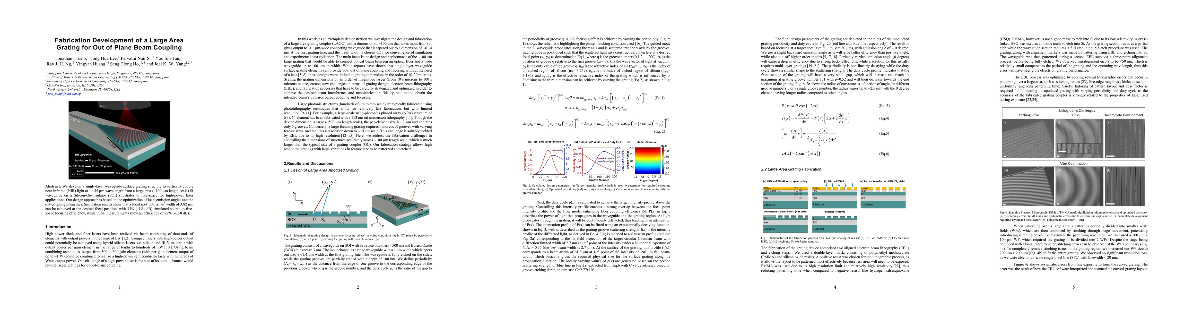 We develop a single-layer waveguide surface grating structure to vertically couple near infrared (NIR) light at ~1.55 um wavelength from a large area (~100 um length scale) Si waveguide on a Silicon-On-Insulator (SOI) substrates to free-space for high-power laser applications. Our design approach is based on the optimization of local emission angles and the out-coupling intensities. Simulation results show that a focal spot with a 1/e2 width of 3.82 um can be achieved at the desired focal position, with 33% (-4.81 dB) simulated source to free-space focusing efficiency, while initial measurements show an efficiency of 22% (-6.58 dB).