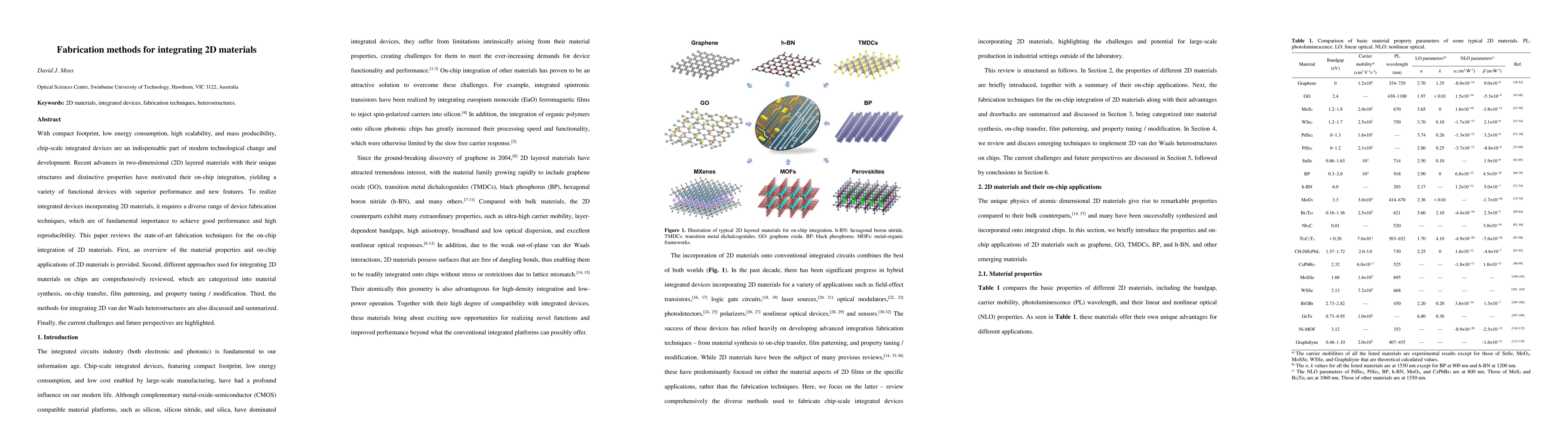 This paper reviews recent advancements in fabricating devices with 2D materials, highlighting various techniques for integrating these materials on chips. It discusses current challenges and future perspectives for achieving high performance and reproducibility in integrated 2D material devices.