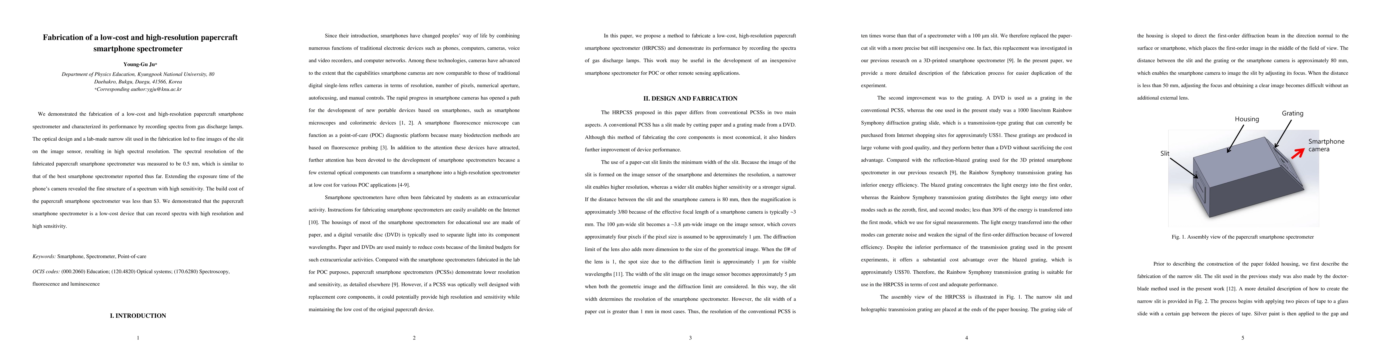 This paper details the creation of a low-cost, high-resolution papercraft smartphone spectrometer with a spectral resolution of 0.5 nm, comparable to existing devices, achieved through an innovative optical design and narrow slit. The device, costing less than $3, demonstrates high sensitivity and resolution in spectral recordings.