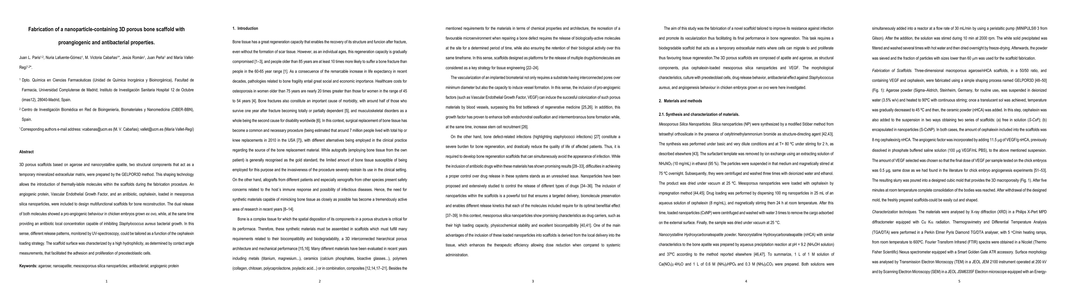 This paper details the fabrication of a 3D porous bone scaffold using agarose and nanocrystalline apatite, incorporating mesoporous silica nanoparticles loaded with Vascular Endothelial Growth Factor and cephalexin for proangiogenic and antibacterial properties, respectively. The scaffold demonstrated effective dual-release capabilities and supported preosteoblastic cell proliferation.
