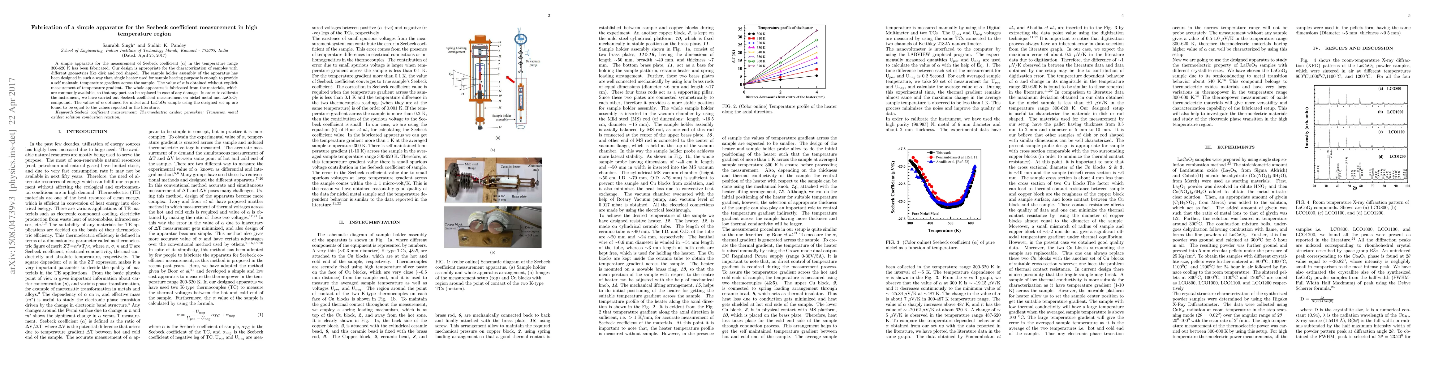 A simple apparatus for measuring Seebeck coefficients in high temperatures has been fabricated, allowing for characterization of samples with different geometries without explicit temperature gradient measurement. The experimentally observed values match literature reports, enabling the study of thermoelectric behavior in oxide materials.