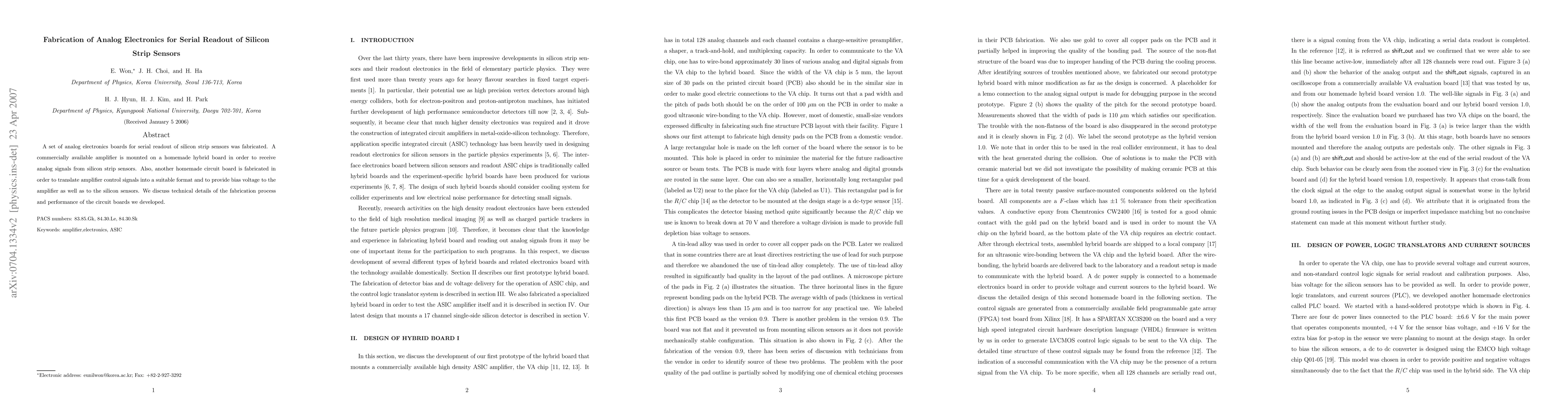 This paper details the fabrication of analog electronics for serial readout of silicon strip sensors, integrating a commercial amplifier with custom hybrid and control boards to optimize signal processing and sensor biasing. The study discusses technical fabrication processes and evaluates the performance of the developed circuit boards.
