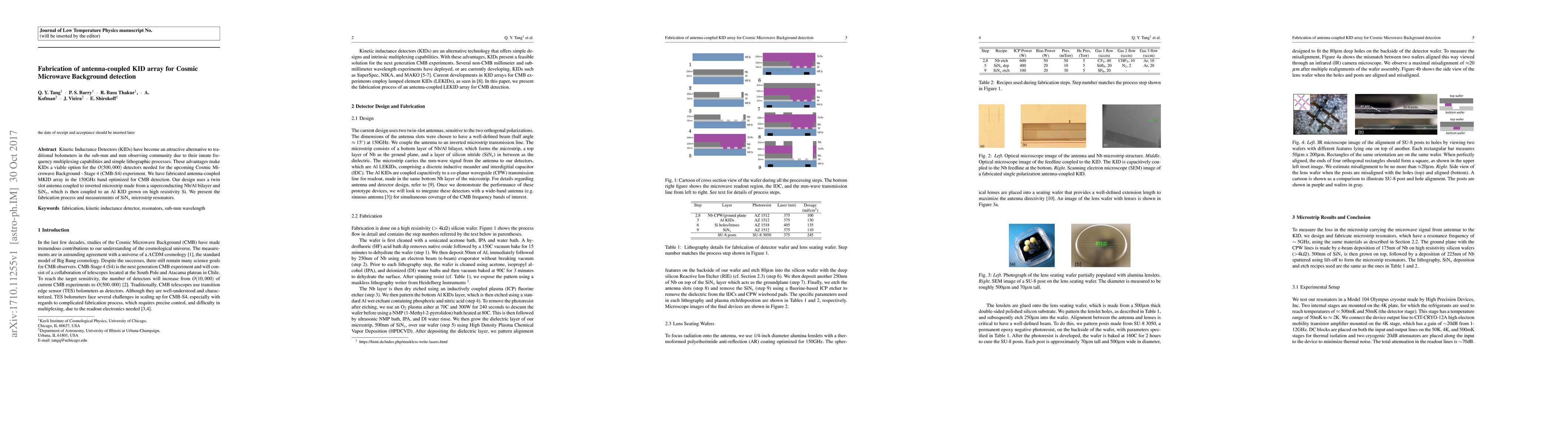 This paper details the fabrication of an antenna-coupled Kinetic Inductance Detector (KID) array optimized for Cosmic Microwave Background detection. The design employs a twin slot antenna coupled to an inverted microstrip resonator made from superconducting Nb/Al and SiN$_x$, which interfaces with an Al KID on high resistivity Si.