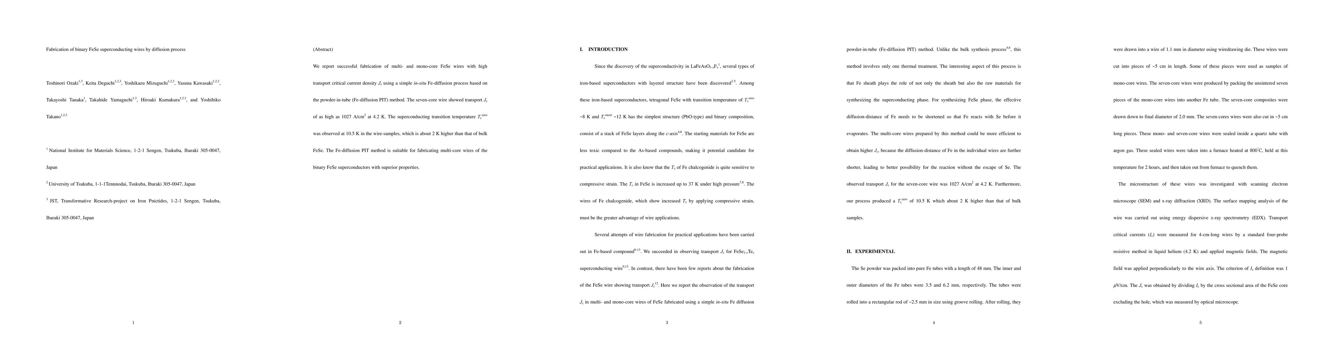 This paper details the fabrication of FeSe superconducting wires using an in-situ Fe-diffusion process via the powder-in-tube method, achieving high transport critical current density and a superconducting transition temperature 2 K higher than bulk FeSe. The method successfully produces multi-core wires with superior properties.