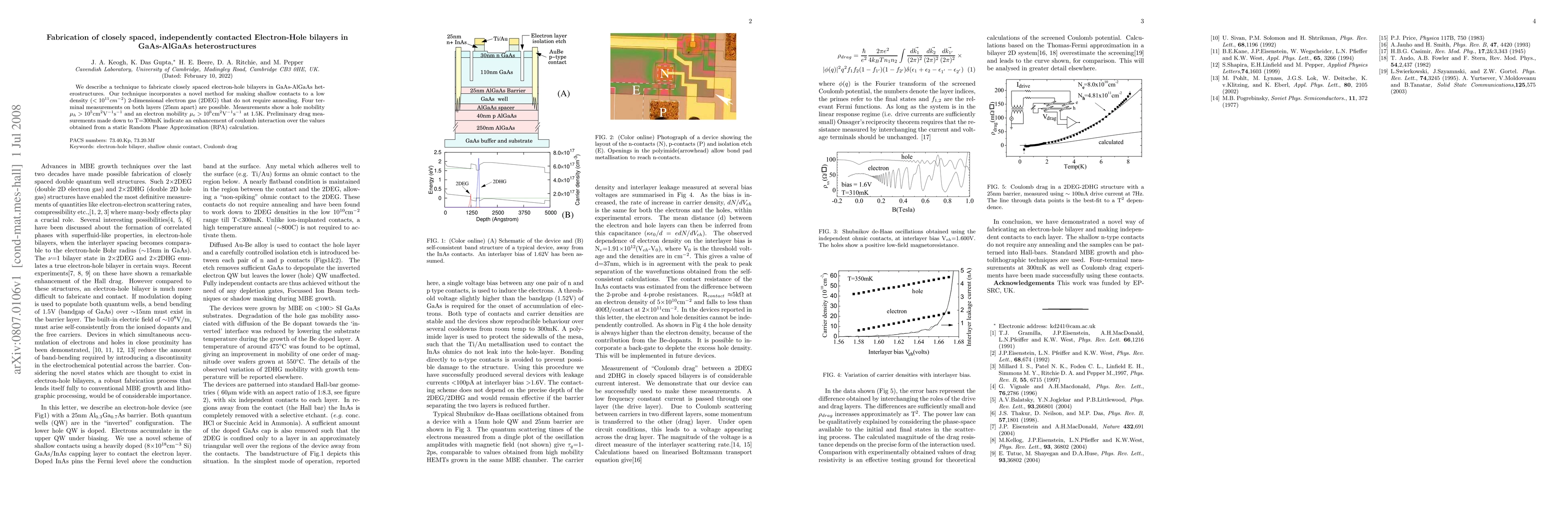 This paper presents a novel fabrication technique for closely spaced, independently contacted electron-hole bilayers in GaAs-AlGaAs heterostructures, achieving high electron and hole mobilities without annealing. Preliminary drag measurements suggest enhanced coulomb interaction compared to static RPA calculations.