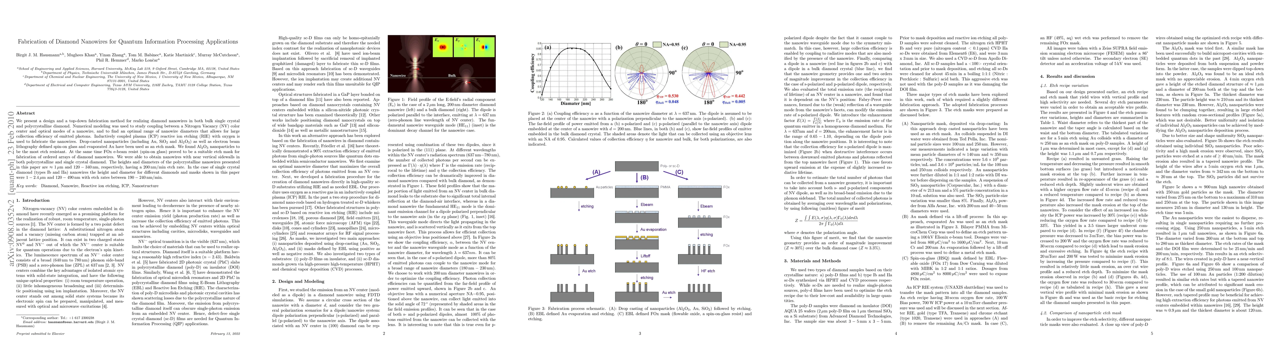 This paper details the fabrication of diamond nanowires using inductively coupled plasma reactive ion etching, focusing on both single crystal and polycrystalline diamond. The study identifies $\mathrm{Al_2O_3}$ nanoparticles as the most etch-resistant mask, while FOx e-beam resist is effective for creating ordered arrays, achieving nanowires with near-vertical sidewalls.