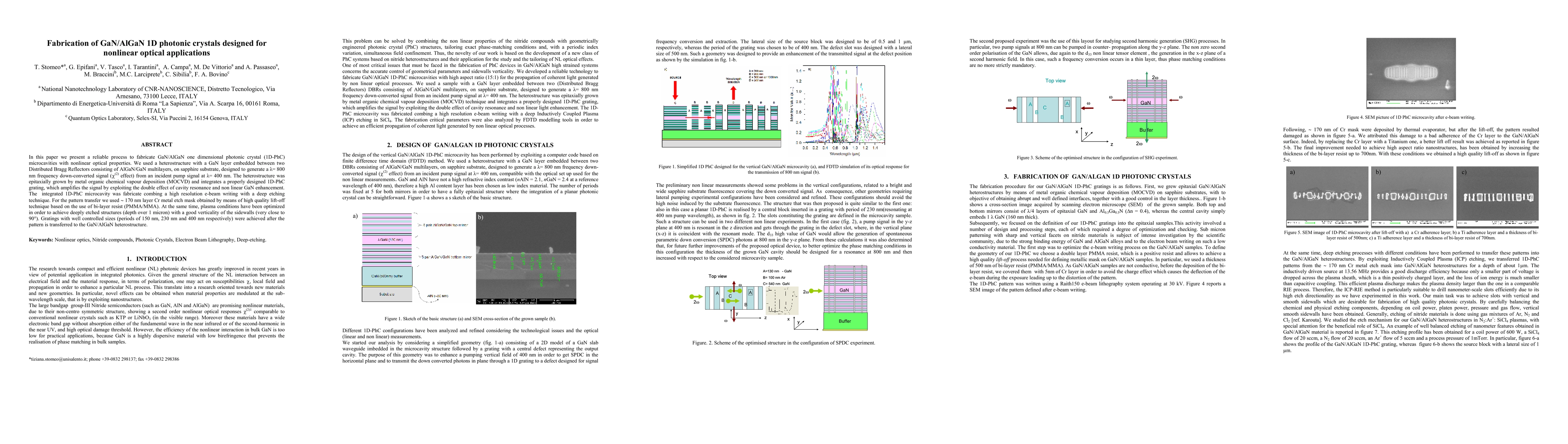 In this paper we present a reliable process to fabricate GaN/AlGaN one dimensional photonic crystal (1D-PhC) microcavities with nonlinear optical properties. We used a heterostructure with a GaN layer embedded between two Distributed Bragg Reflectors consisting of AlGaN/GaN multilayers, on sapphire substrate, designed to generate a {\lambda}= 800 nm frequency down-converted signal (\chi^(2) effect) from an incident pump signal at {\lambda}= 400 nm. The heterostructure was epitaxially grown by metal organic chemical vapour deposition (MOCVD) and integrates a properly designed 1D-PhC grating, which amplifies the signal by exploiting the double effect of cavity resonance and non linear GaN enhancement. The integrated 1D-PhC microcavity was fabricate combing a high resolution e-beam writing with a deep etching technique. For the pattern transfer we used ~ 170 nm layer Cr metal etch mask obtained by means of high quality lift-off technique based on the use of bi-layer resist (PMMA/MMA). At the same time, plasma conditions have been optimized in order to achieve deeply etched structures (depth over 1 micron) with a good verticality of the sidewalls (very close to 90{\deg}). Gratings with well controlled sizes (periods of 150 nm, 230 nm and 400 nm respectively) were achieved after the pattern is transferred to the GaN/AlGaN heterostructure.