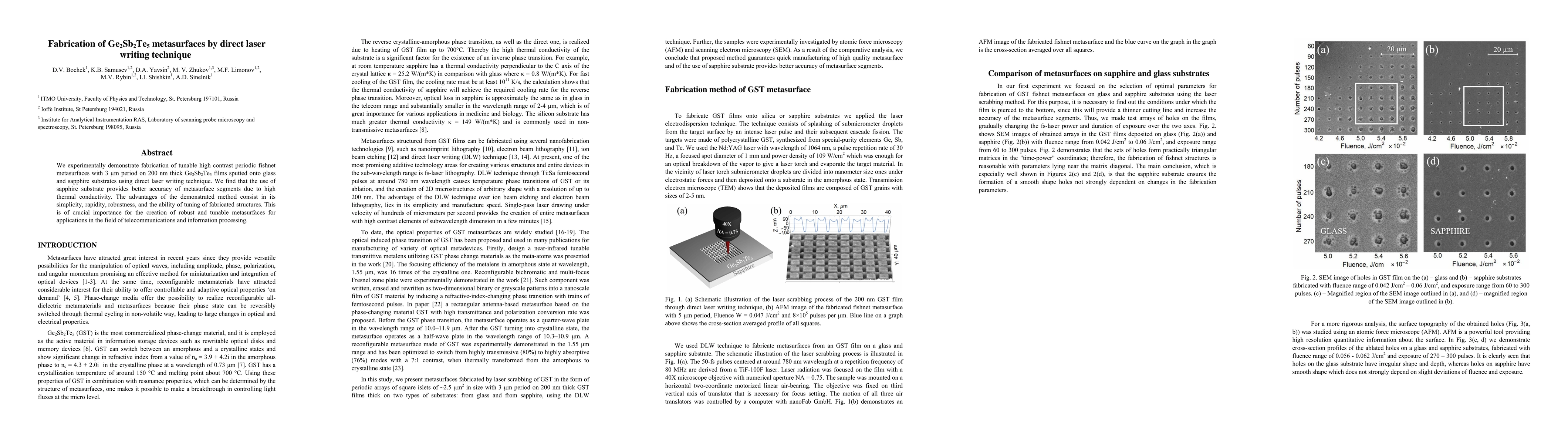 This paper demonstrates the fabrication of tunable, high-contrast fishnet metasurfaces using direct laser writing on Ge2Sb2Te5 films. The study finds that sapphire substrates offer better accuracy due to higher thermal conductivity, highlighting the simplicity and robustness of the method for applications in telecommunications and information processing.