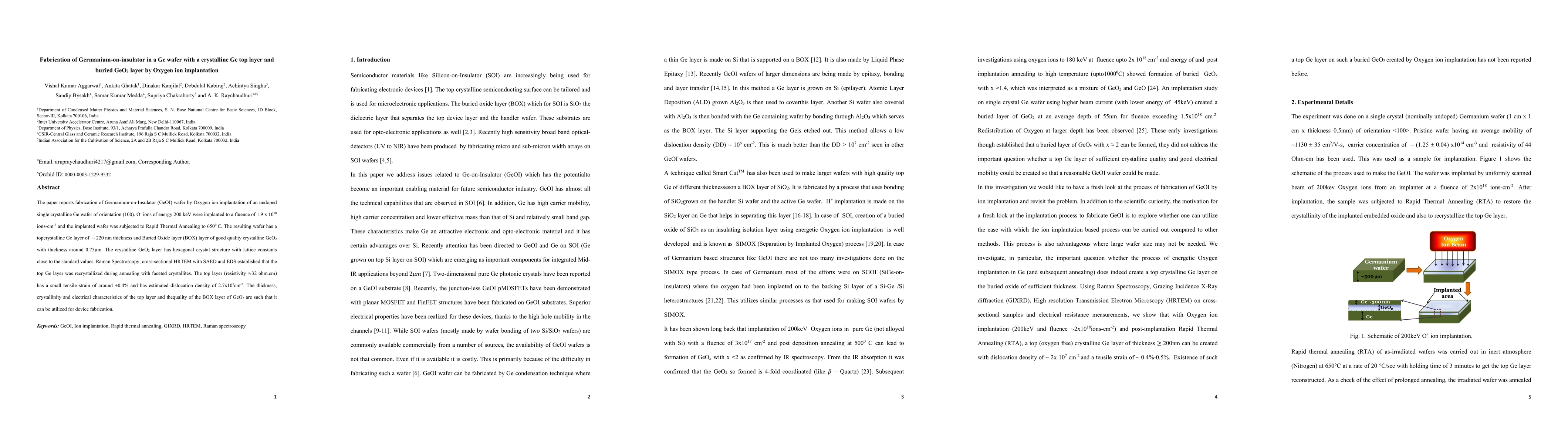 This paper details the fabrication of a Germanium-on-Insulator (GeOI) wafer using Oxygen ion implantation and subsequent annealing, resulting in a high-quality crystalline Ge top layer and a hexagonal GeO2 buried oxide layer suitable for device fabrication. The top layer exhibits a small tensile strain and manageable dislocation density.