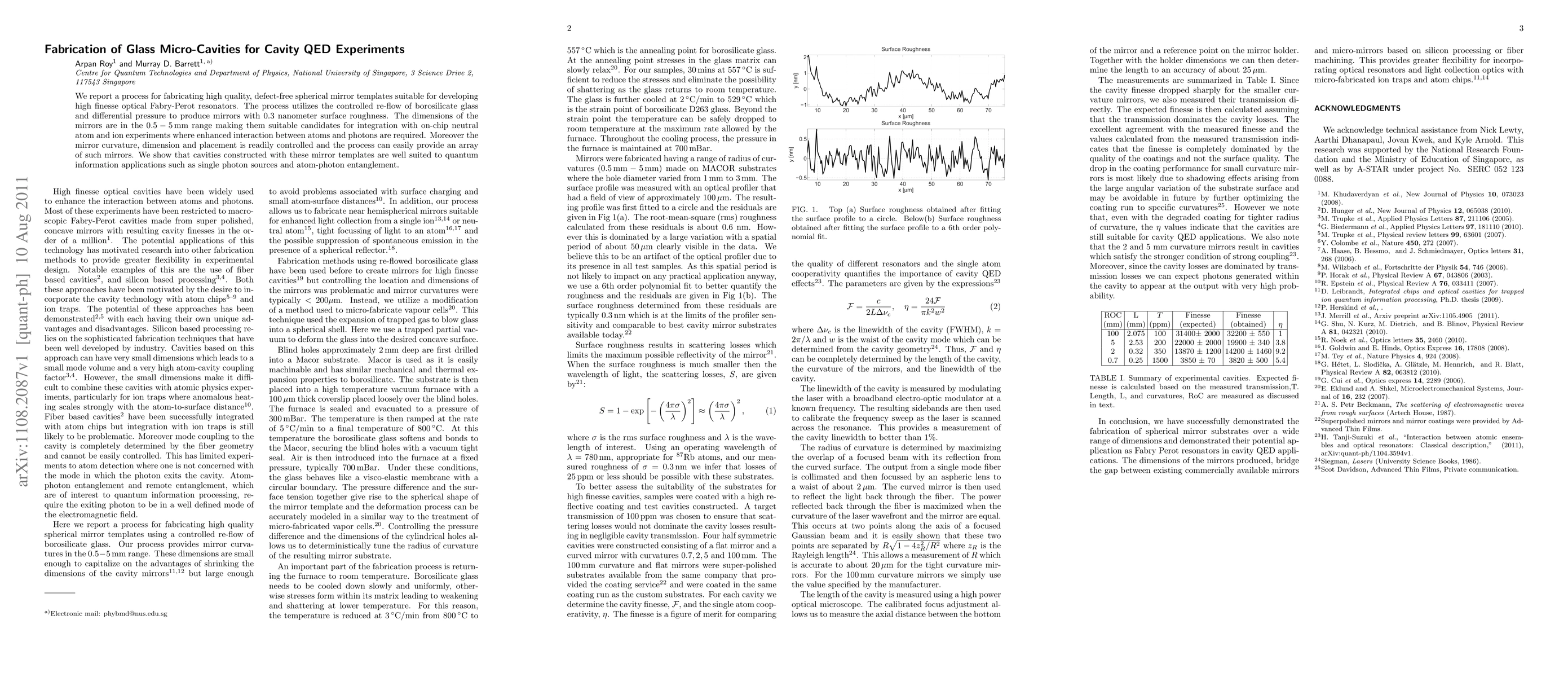 We report a process for fabricating high quality, defect-free spherical mirror templates suitable for developing high finesse optical Fabry-Perot resonators. The process utilizes the controlled reflow of borosilicate glass and differential pressure to produce mirrors with 0.3 nanometer surface roughness. The dimensions of the mirrors are in the 0.5-5mm range making them suitable candidates for integration with on-chip neutral atom and ion experiments where enhanced interaction between atoms and photons are required. Moreover the mirror curvature, dimension and placement is readily controlled and the process can easily provide an array of such mirrors. We show that cavities constructed with these mirror templates are well suited to quantum information applications such as single photon sources and atom-photon entanglement.