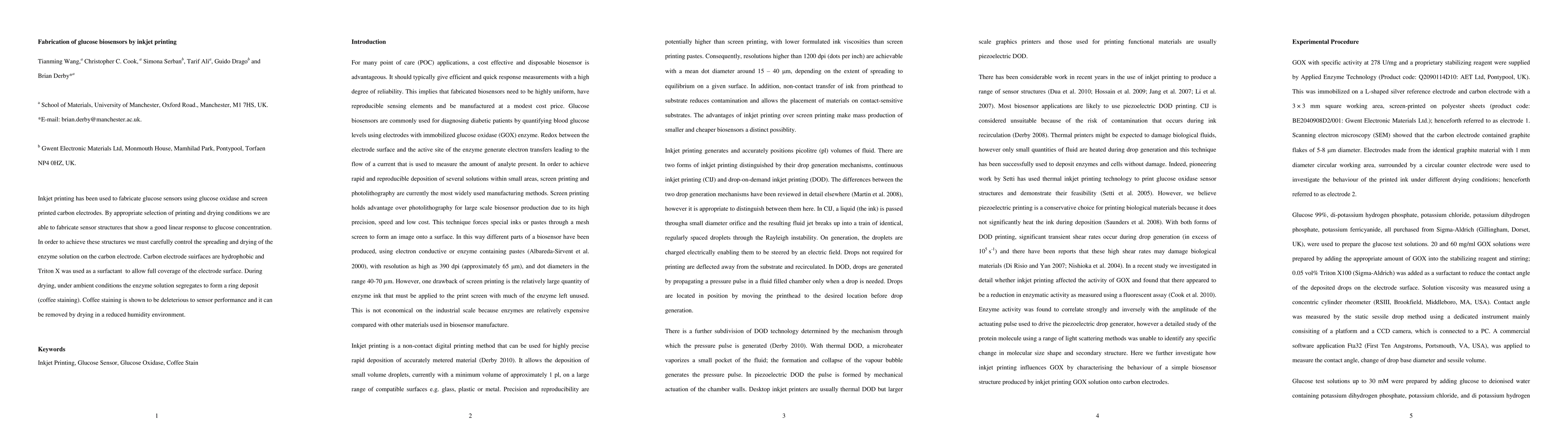 This study demonstrates the fabrication of glucose biosensors via inkjet printing of glucose oxidase on carbon electrodes, achieving a linear response to glucose. To improve sensor performance, surfactants and controlled drying conditions were employed to prevent deleterious coffee staining effects.